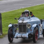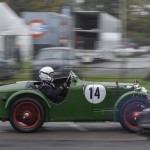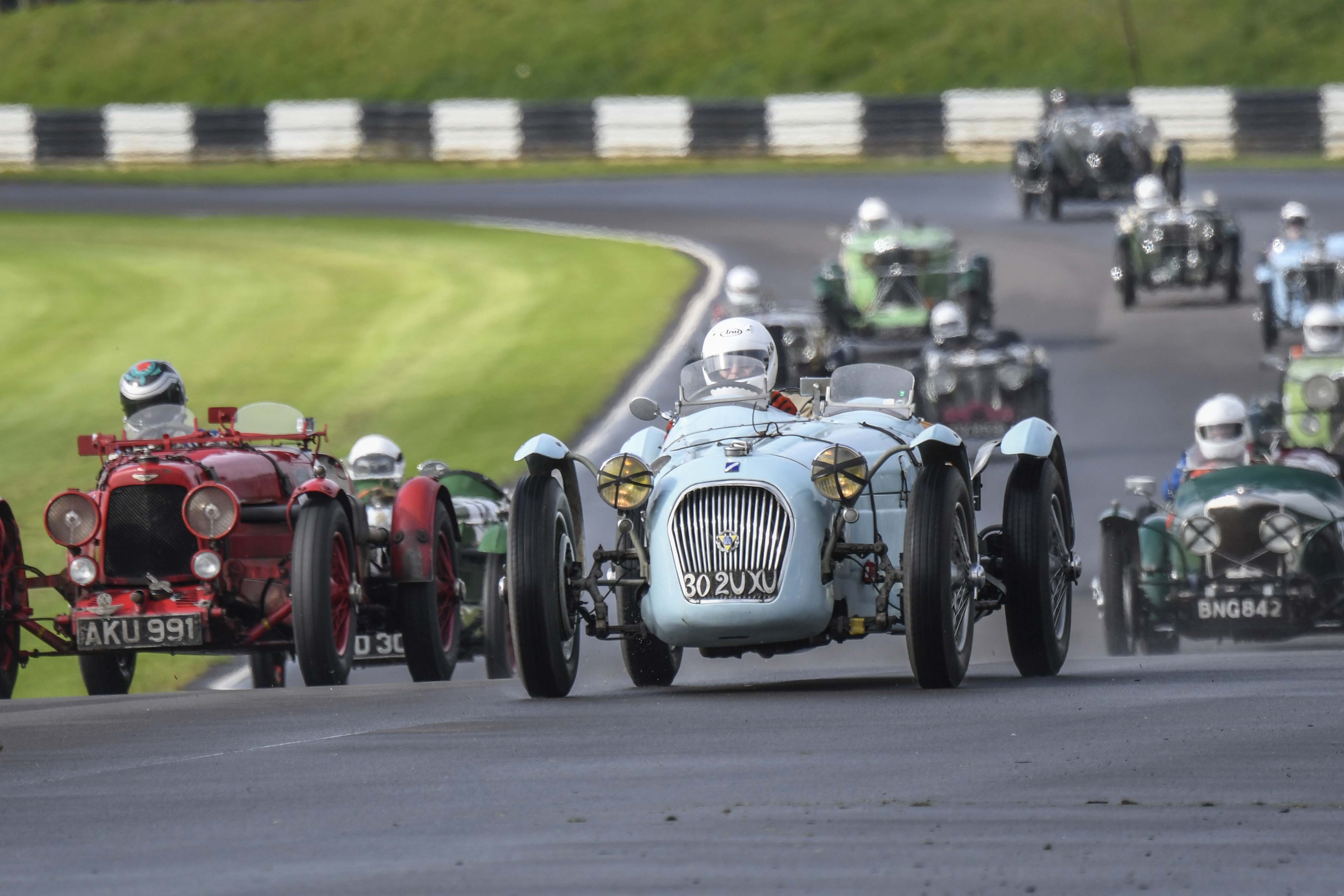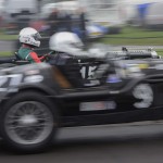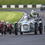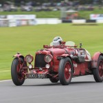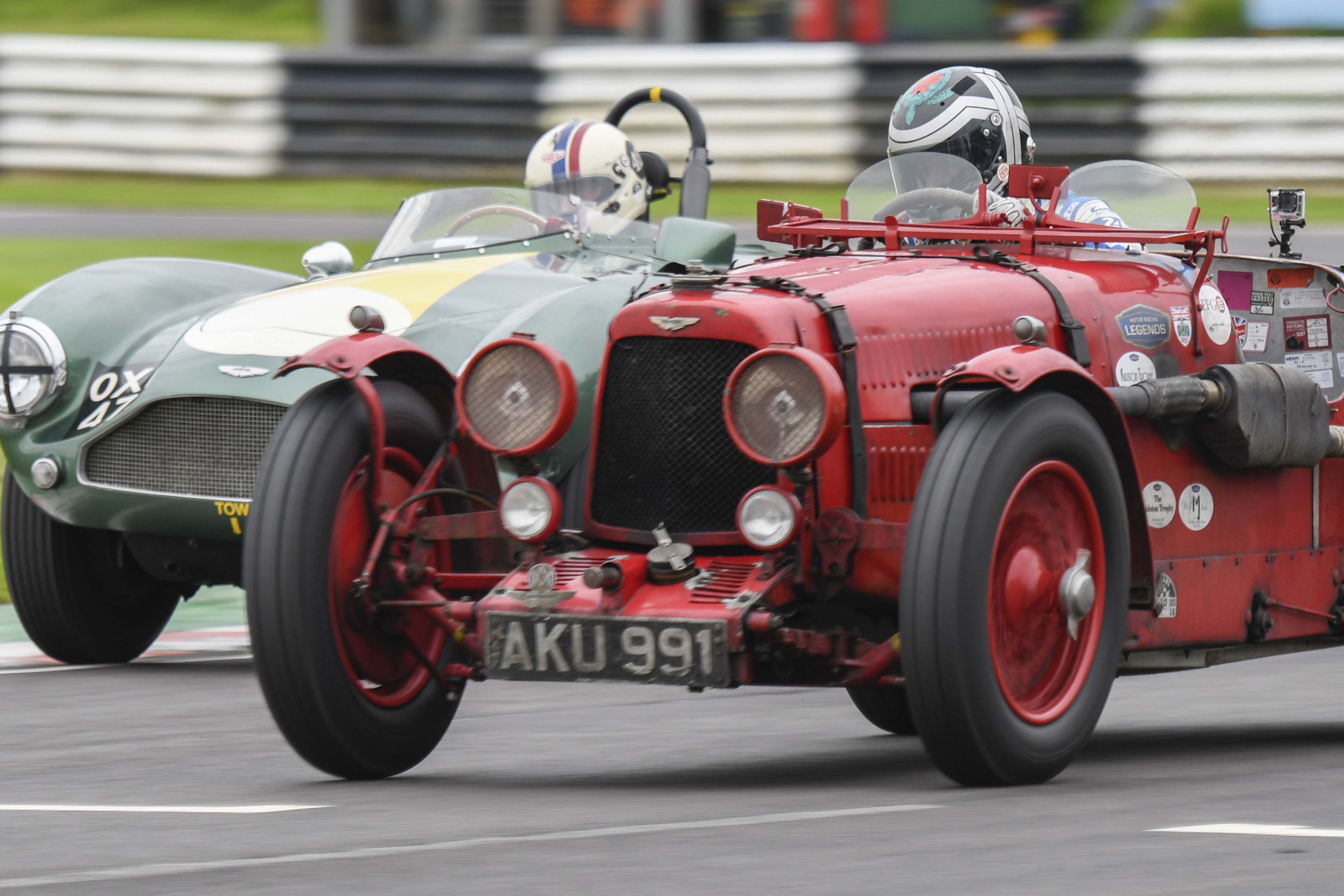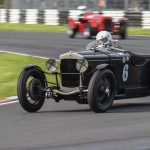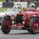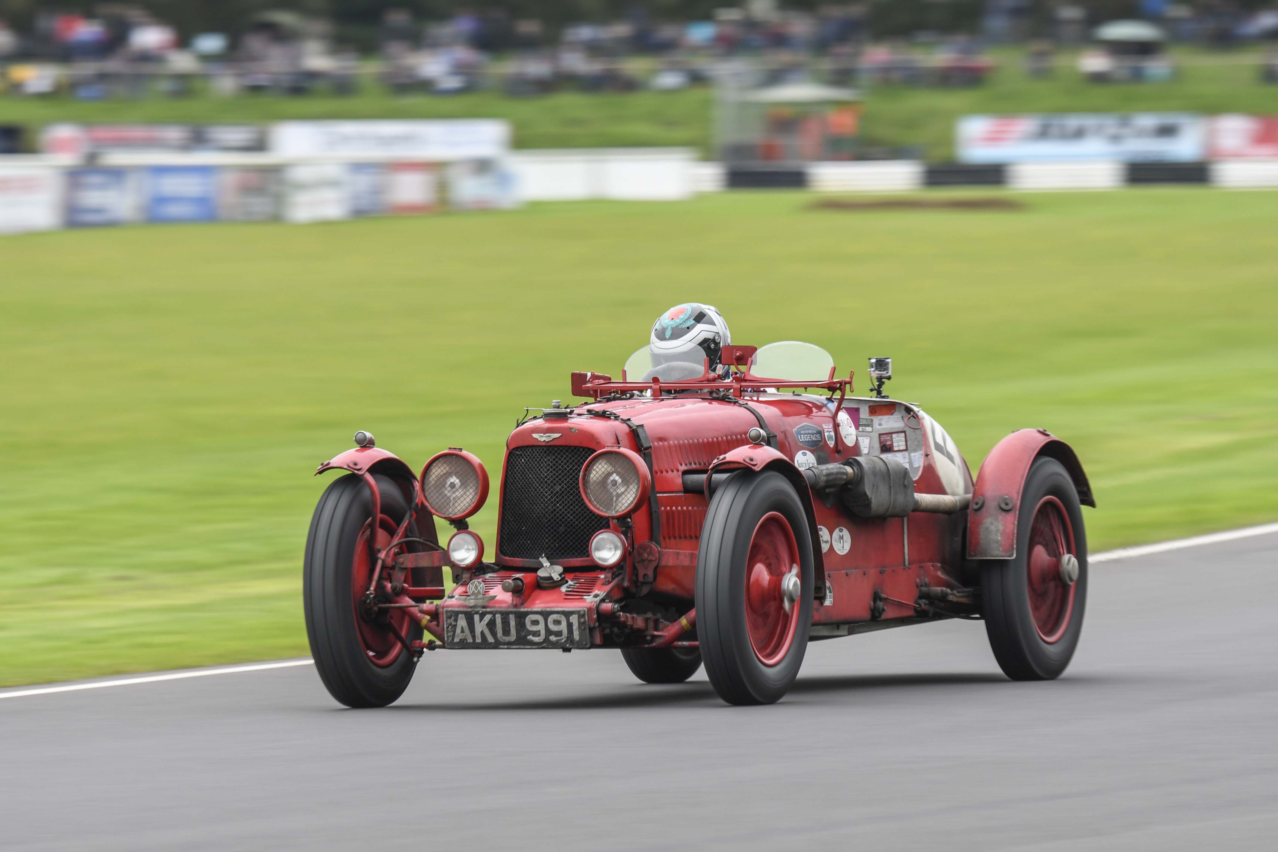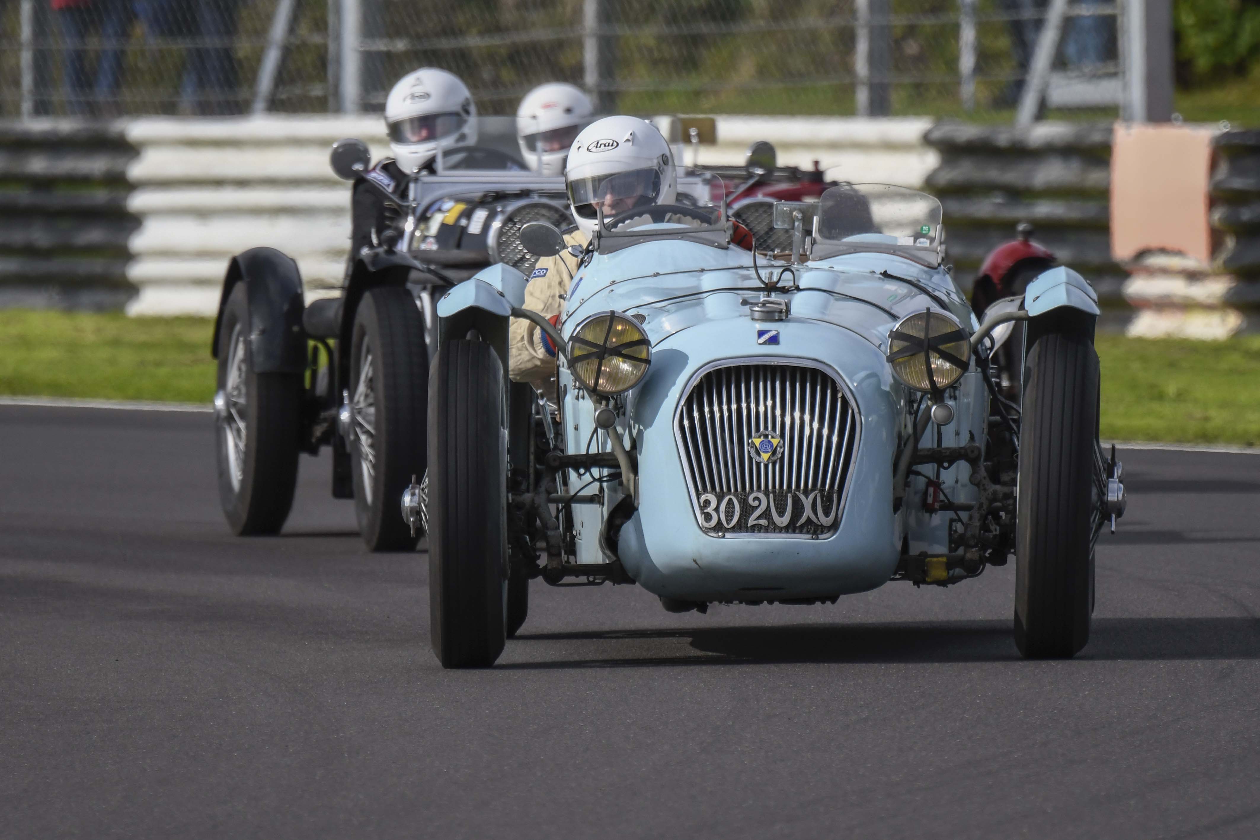 Patrick Blakeney-Edwards dominated the Vintage Sports Car Club’s Formula Vintage race for Pre-war sports, taking his Frazer Nash Super Sports from pole to a 5” win over his young rival Eddy Williams in a similar car. Mark Gillies was over optimistic at the restart after an initial ‘Safety Car’ period, taking 3rd on the road in his Aston Martin Monoposto, but demoted to 5th with a 30” penalty, handing his place to Tim Kneller in the Riley TT Sprite.