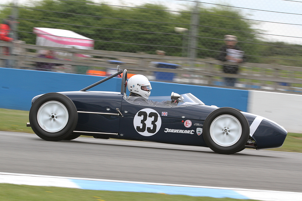 Four races for Formula Juniors got the FJHRA/HSCC Silverline Formula Junior UK Championship off to a fine start with an entry of almost 60 cars. The two front-engined races were real crowd pleasers as John Sykes gave his rare Merlyn Mk2 a pair of wins against a fierce challenge from the Lola Mk2s of Robin Longdon and Justin Fleming.