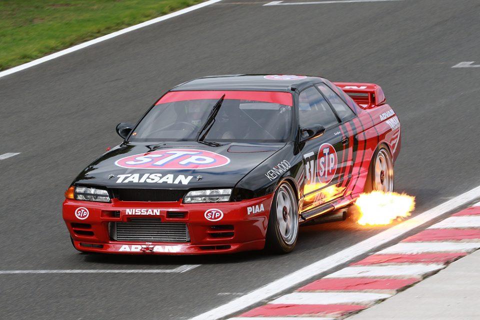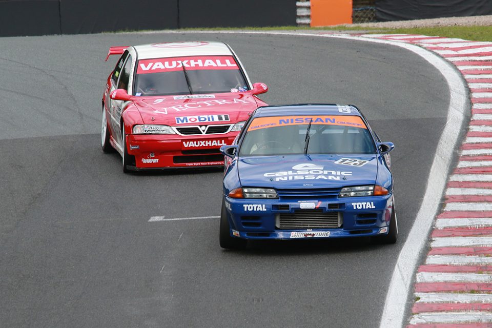 Later Touring Cars contested two races for the Dunlop Saloon Car Cup and there was victory in the first race for the fire-breathing Nissan R32 of local ace Ric Wood. Jason Hughes (Vauxhall Vectra) pressed Wood hard in the first race and then won on Monday when Wood retired with a blown turbo and Simon Garrad had to ease his pace in his Nissan.