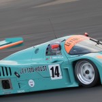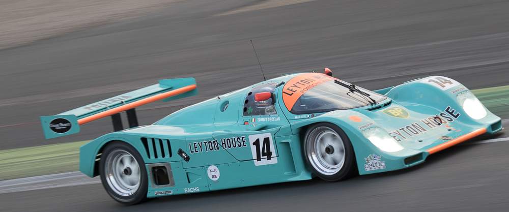 Stirring up memories of Le Mans in the eighties, Nathan Kinch took full advantage of pole position in his Judd V10 powered Lola. Behind the two Nissan R93s of Bob Berridge and Katsu Kubota, Christophe D’Ansembourg’s high-tech Jaguar XJR14 and Mark Sumpter’s Porsche 962 were all sending up sparks in the dusk as they skirmished for second.