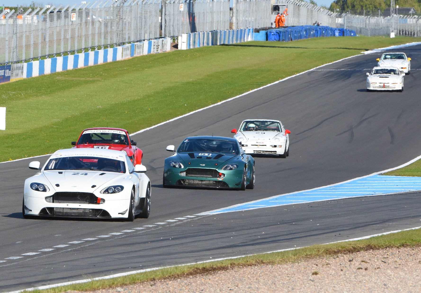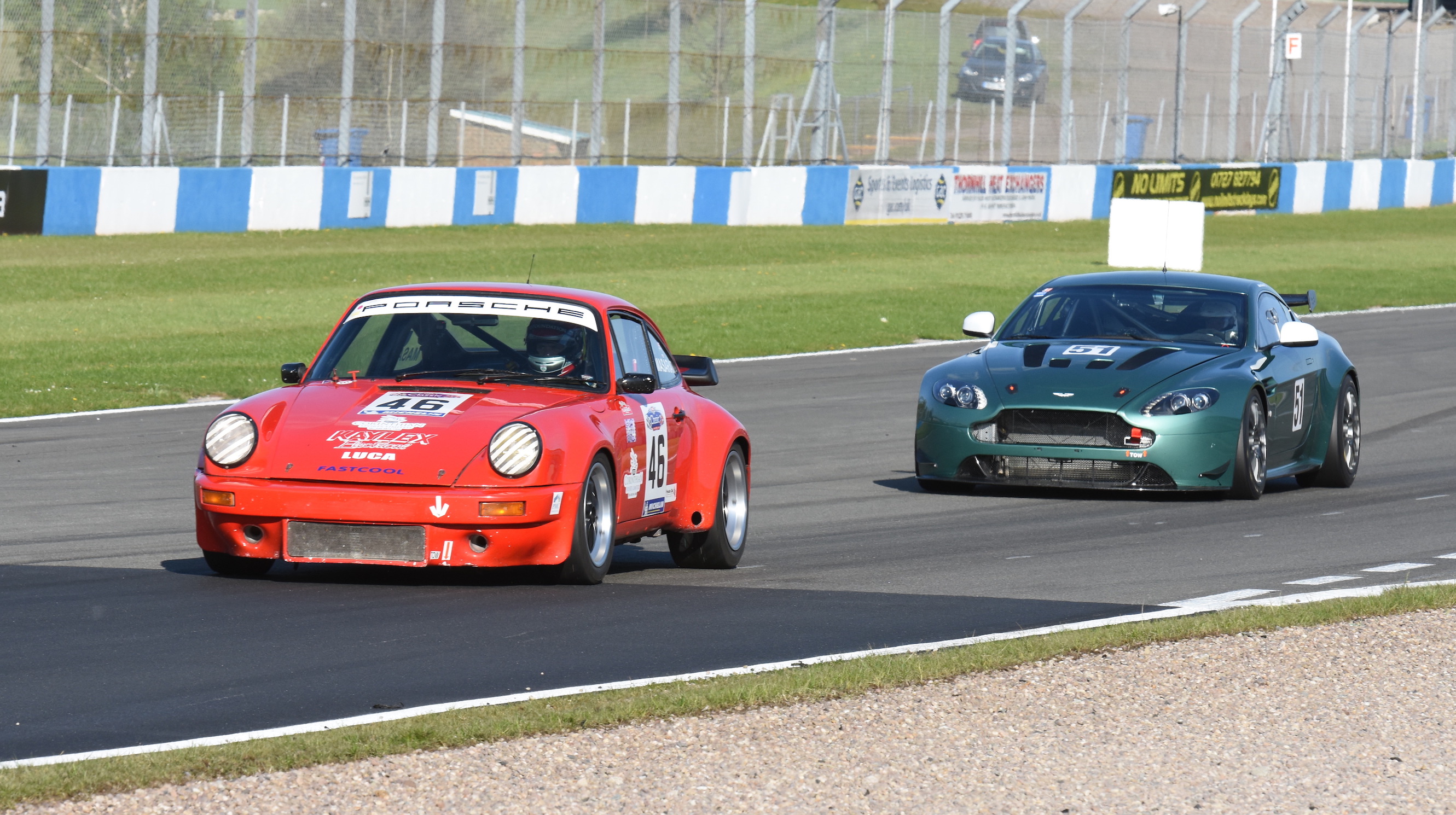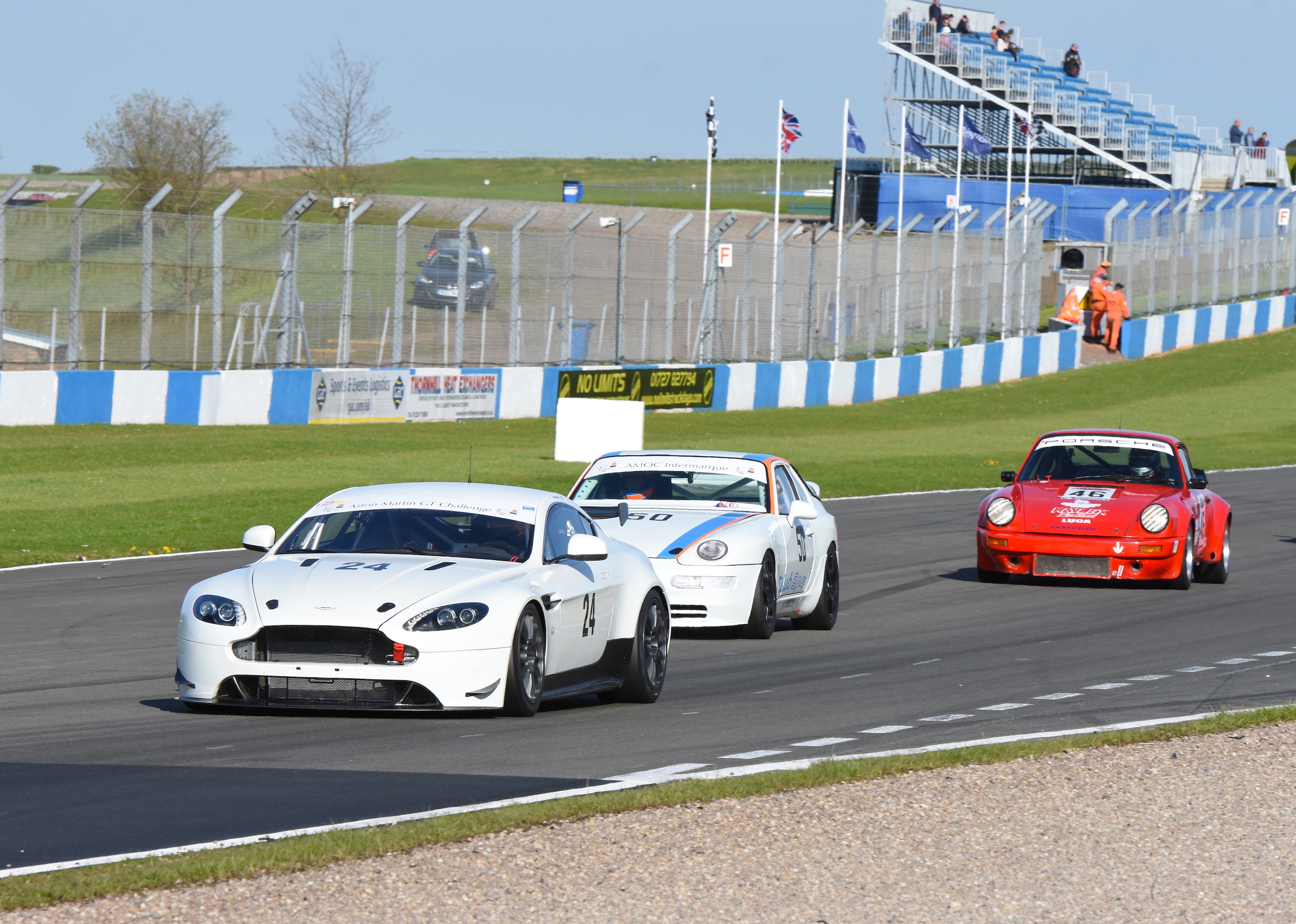 Further down the grid in the AMOC Intermarque battle a poor start by pole sitter James Hilliard allowed the Porsche 968 CS of Steve Atkinson to sneak through to lead in the early stages, with Piers Maserati in 2nd and Hilliard in 3rd caught up in a battle with the Aston Martin GT4 Challenge car of Robin Marriott.