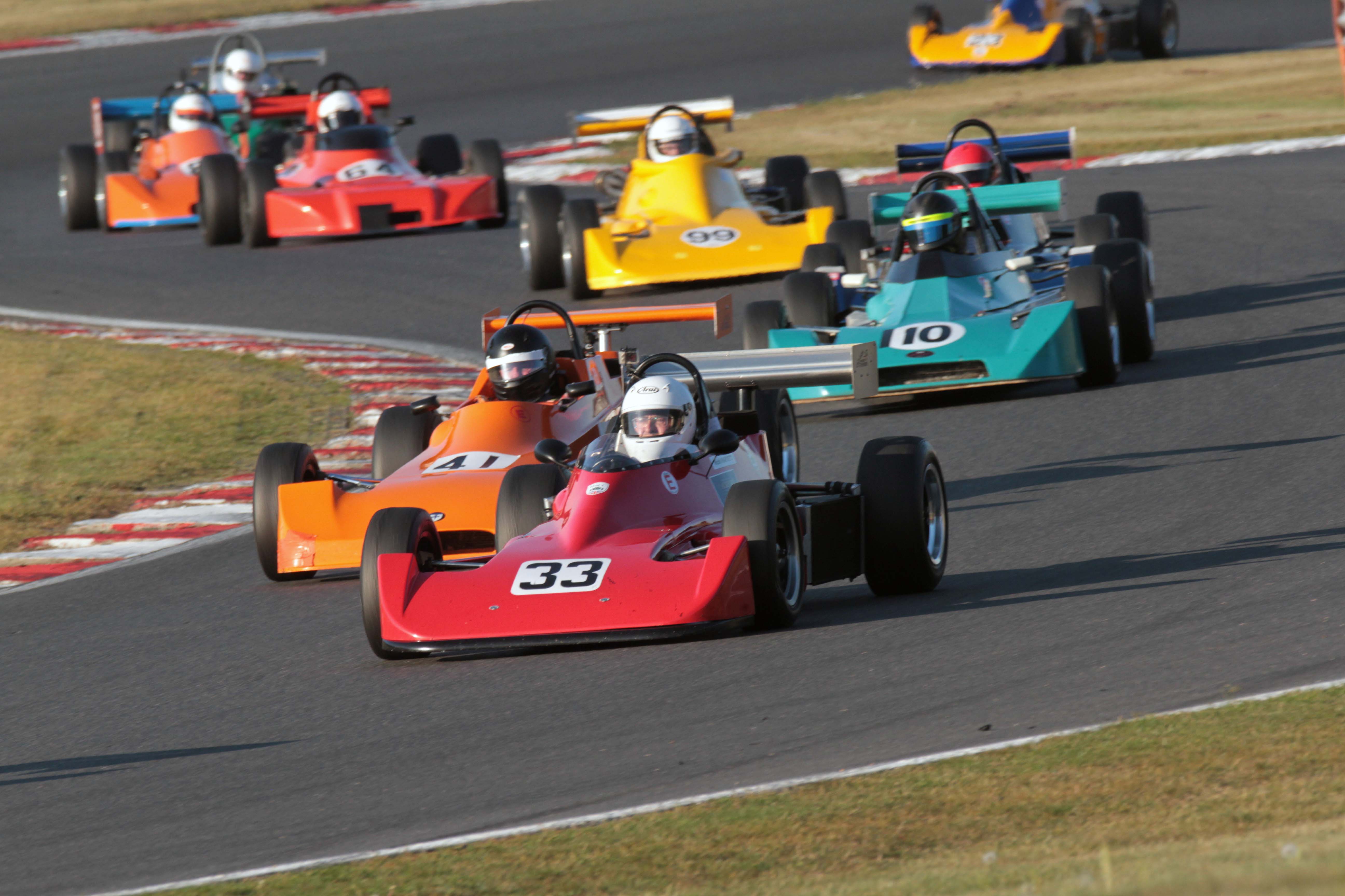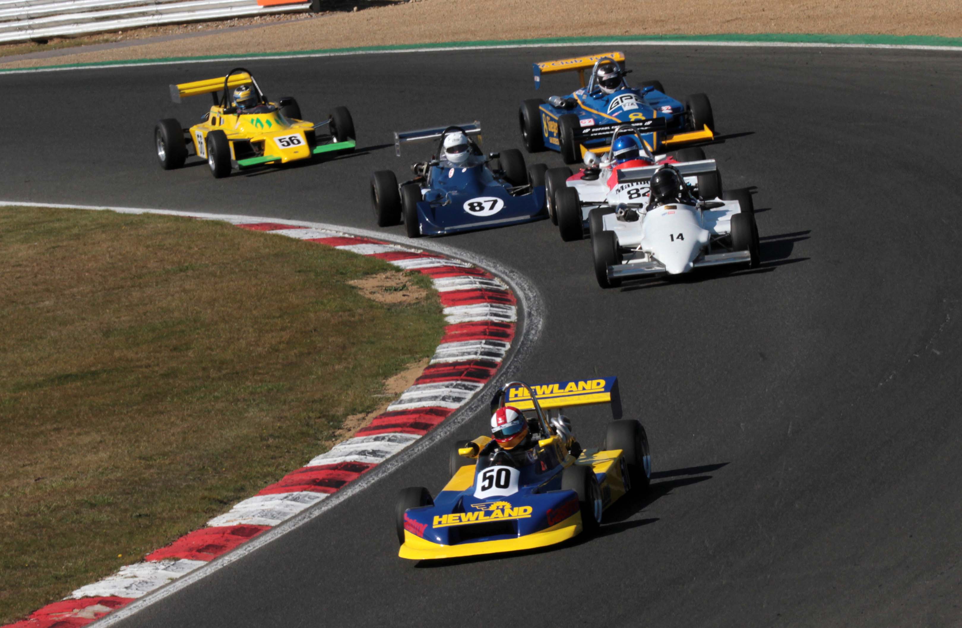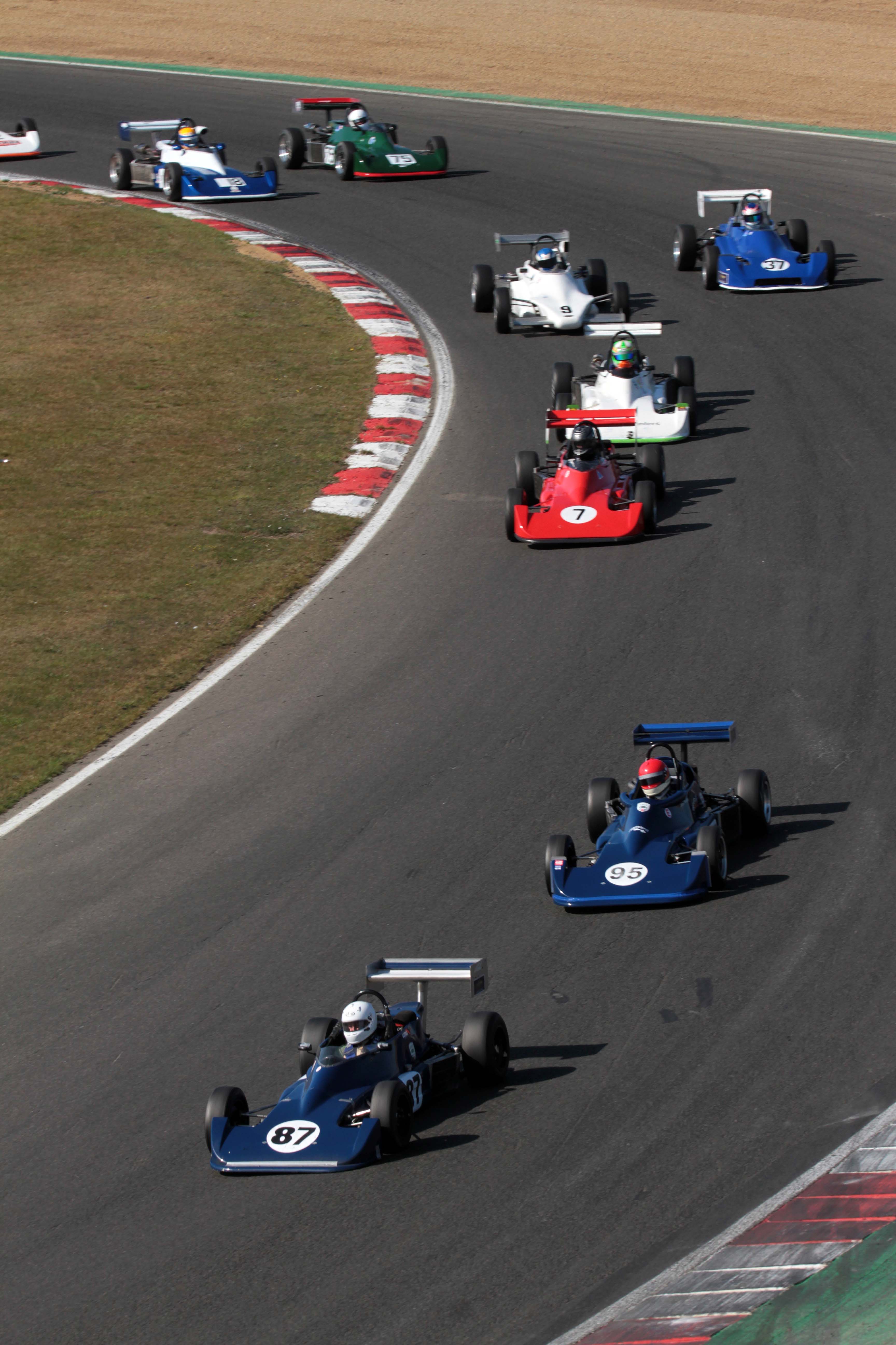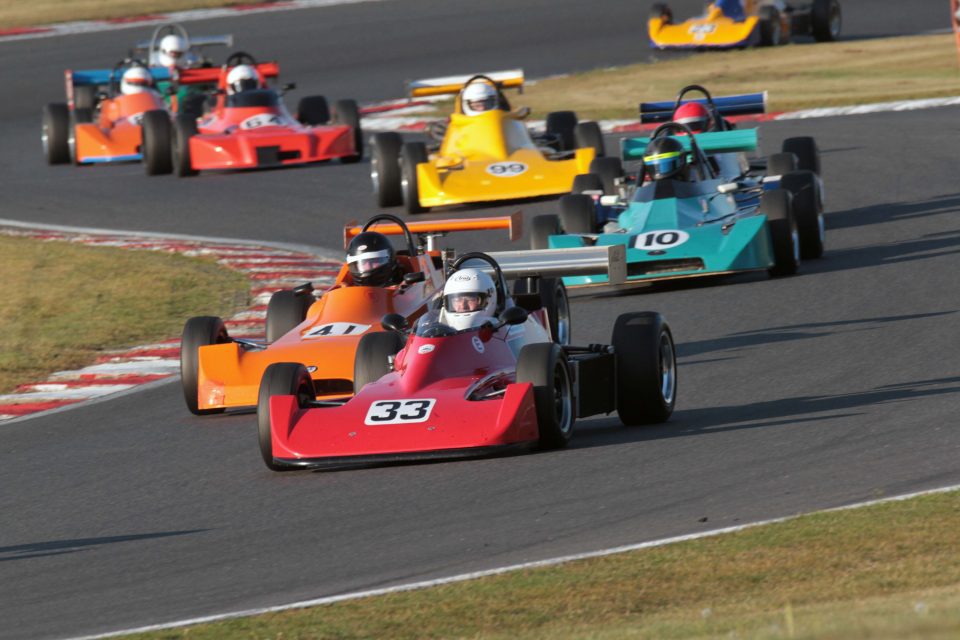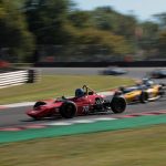 Andrew Park took a double win in Historic FF2000 to close in on a fourth straight title. Ian Pearson was the big threat to the Cumbrian but was fortunate to retain second when the first race was red-flagged just after he’d had a wild ride through the gravel at an oily Paddock Hill Bend. Park had a slightly easier time in the second race as Pearson countered concerns about his clutch to lead the chase while Nelson Rowe again completed the podium.