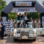 After 21 days on the rally, Michael Velasco and Peter St George lead the class for classic cars over 2000cc built between 1947 and 1975, in their 1971 Mercedes Benz 280S, celebrating their first ever win.