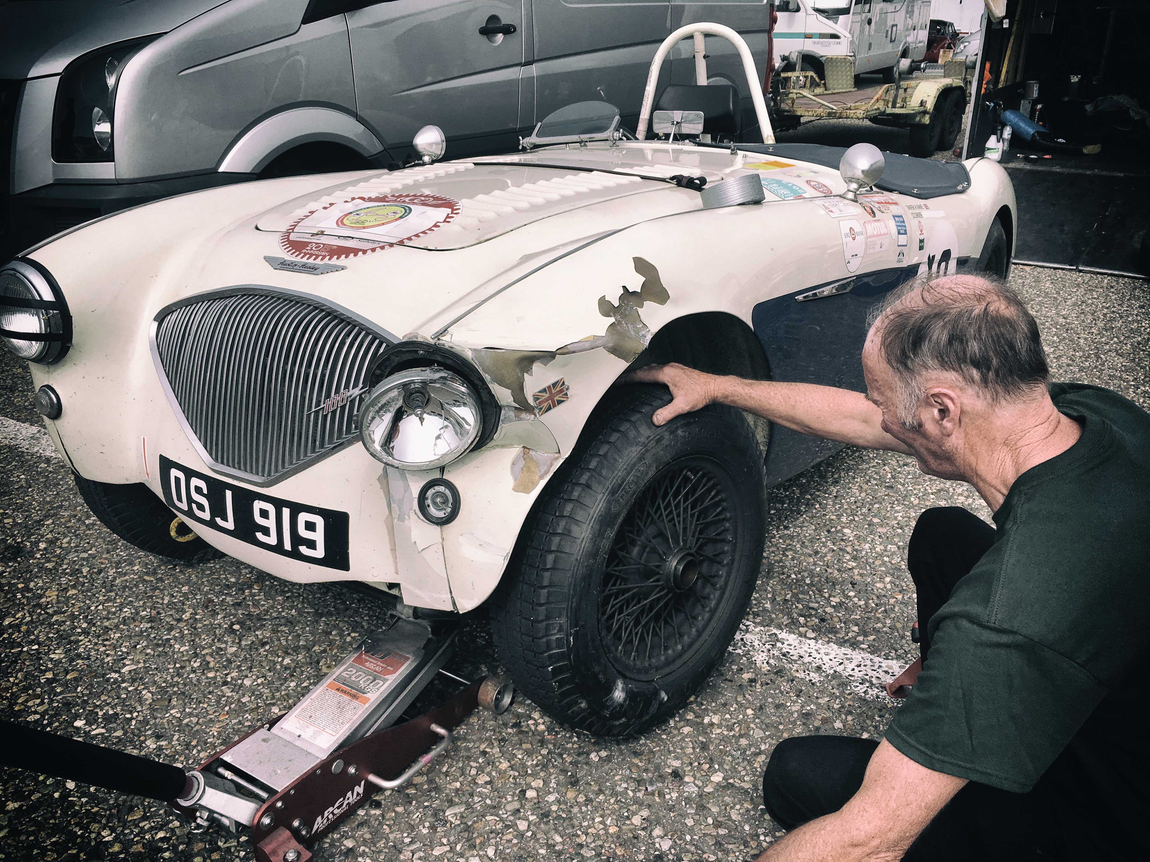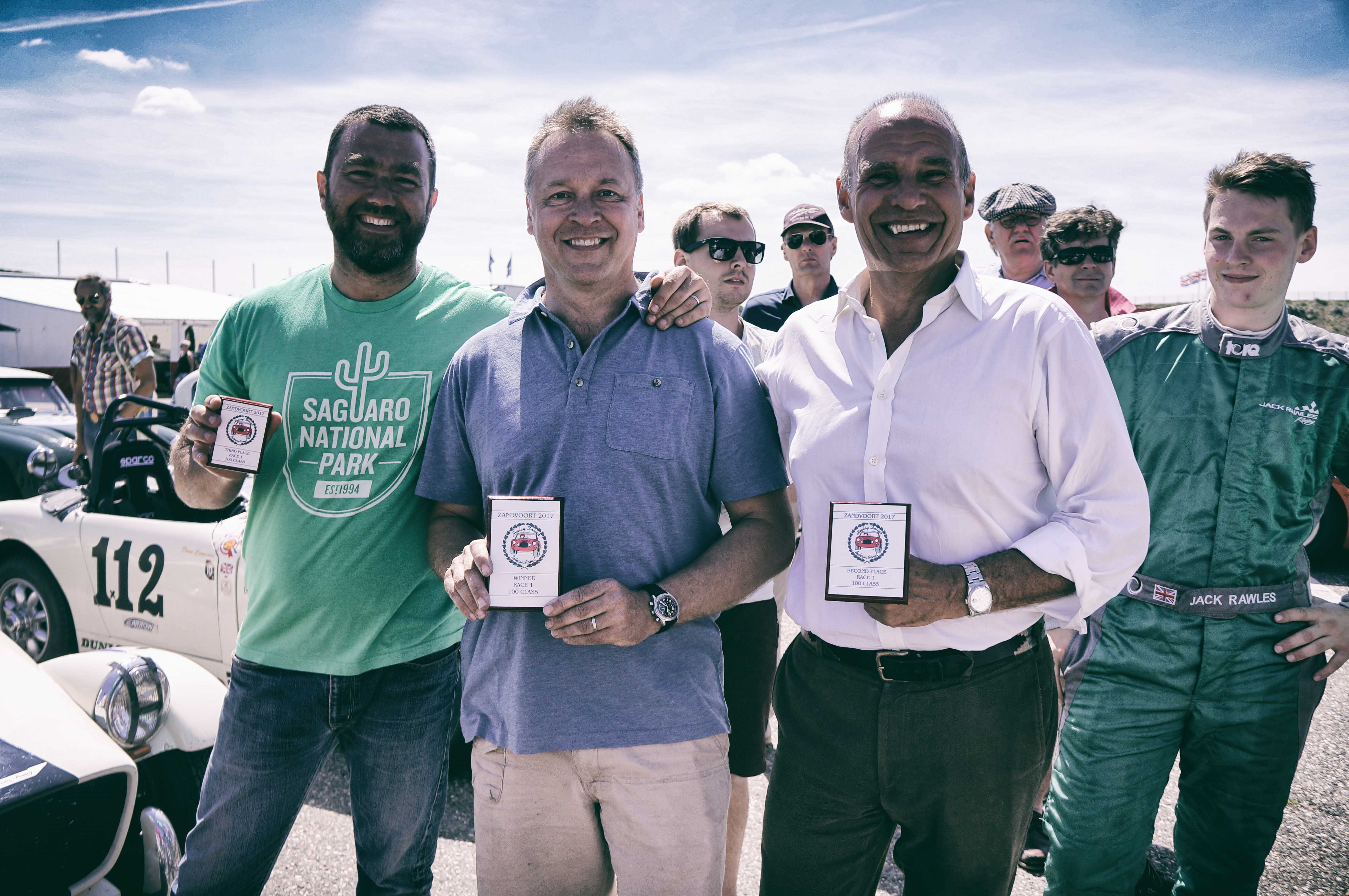In the battle of the Healey 100s Nick Matthews absence from the grid, left Mike Thorne unchallenged to pick up two class wins and the Dave Hardy Memorial Trophy. Robert Rawe should have won the prize for Britishness, having driven his Healey 100 from London out to the circuit through Thurday’s torrential rain and thunderstorms. After a coming together with a Ginetta in testing, the Chatham family rallied round to straighten the stricken 100 and get Robert back out on track. Robert duly finished 2nd in both races and drove home with no further issues!