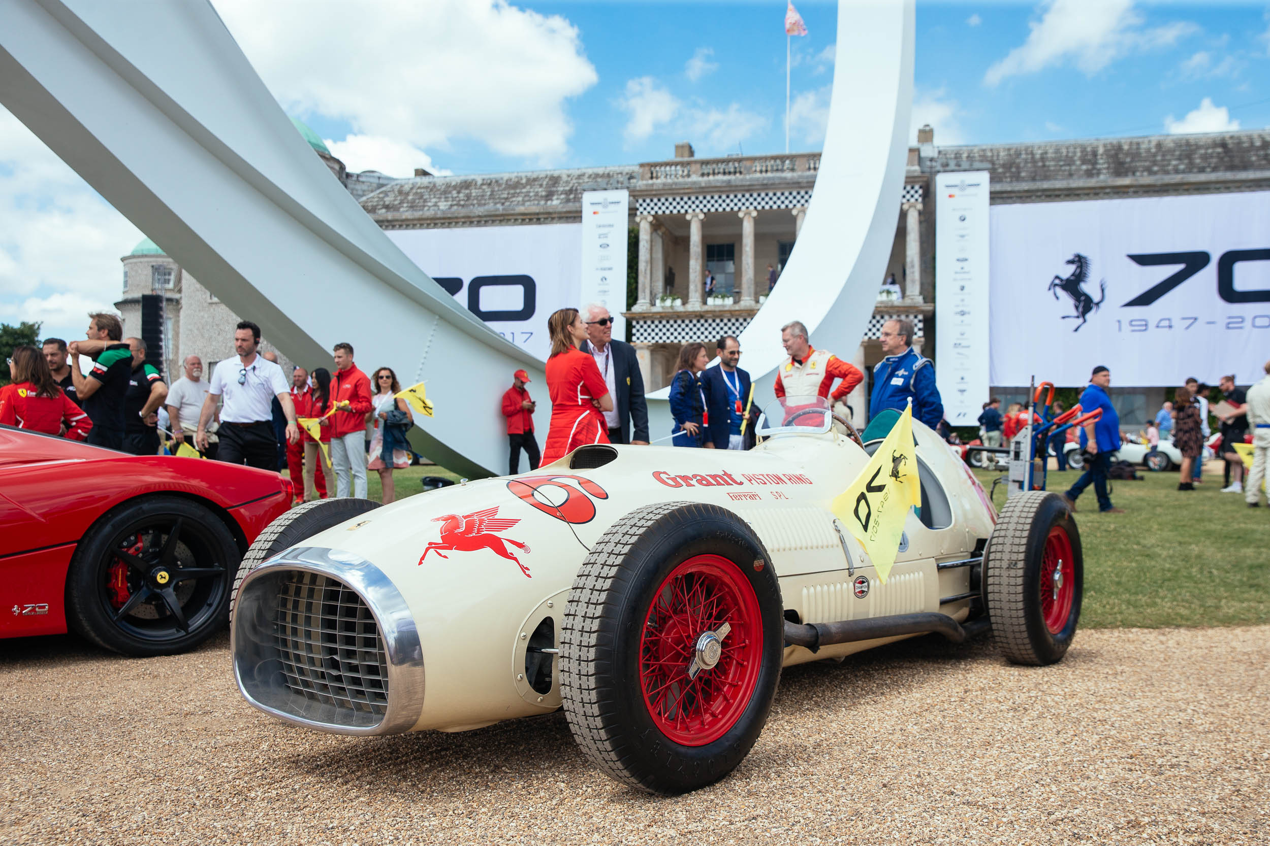 As part of the Ferrari’s spectacular collection for their 70th anniversary the fabulous 375 ‘Grant Pistons Ring Special’ took to the hill. A modified version of a Grand Prix titan which star driver Johnny Parson attempted to qualify for the 1952 Indianapolis 500. It failed to make the cut and has made only sporadic public appearances since, it now resided West Sussex courtesy of The Louwman Museum.