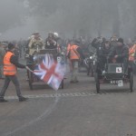 Before the start Evans, Jones and Bruce were joined by Natalie Lowe from Strictly Come Dancing and Robert Brooks, Chairman of Bonhams, for the ceremonial tearing up of the red flag. The symbolic ritual harks back to the original Emancipation Run, held on 14 November 1896, which marked the milestone Locomotives on the Highway Act and raised the speed limit for ‘light locomotives’ from 4 to 14mph abolishing the need for a man walking ahead of the cars waving a red flag.