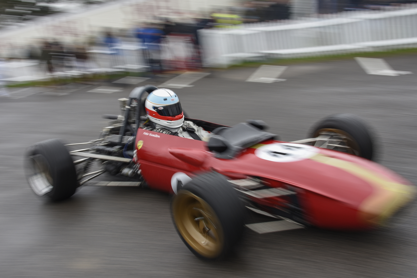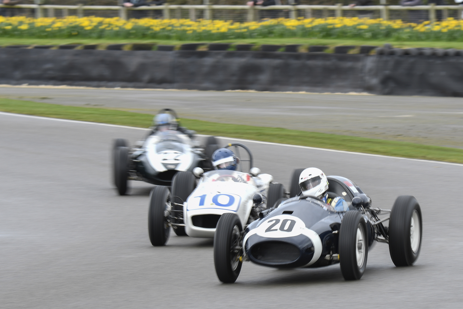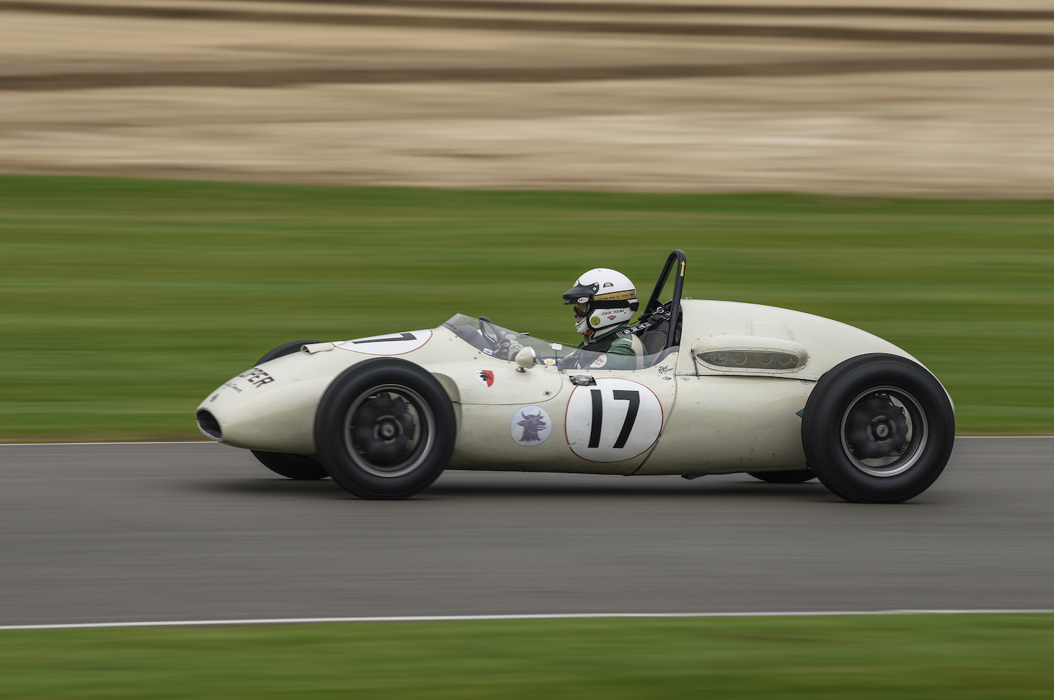 Andrew Hibberd was in a class of one as he claimed honours in the Derek Bell Cup at the 75th Members’ Meeting. The race for one-litre Formula Three ‘Screamers’ saw plenty of action up and down the order, with pole-sitter Hibberd surviving a grassy moment on the first lap to establish an unshakable lead. He simply disappeared into the distance during the 20-minute rate, steering the ex-Chequered Flag Brabham BT18 which won at Goodwood in period. Hibberd’s victory margin was an astonishing 39sec.