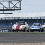 Thirty nine of the 41 cars which qualified started Sunday’s race. Although John Clark was unable to take up his pole position, co-driver Keen – whose 2m25.317s (90.16mph) standard was 4.306s better than anybody else in Saturday’s drizzly half-hour on the Historic Grand Prix circuit – having coached the race co-sponsor to superb personal bests in Friday testing, as a non-owner and sole driver, would have to sit stationary for one minute at each of the two mandatory stops while rivals were free to change as quickly as possible incidentally.
