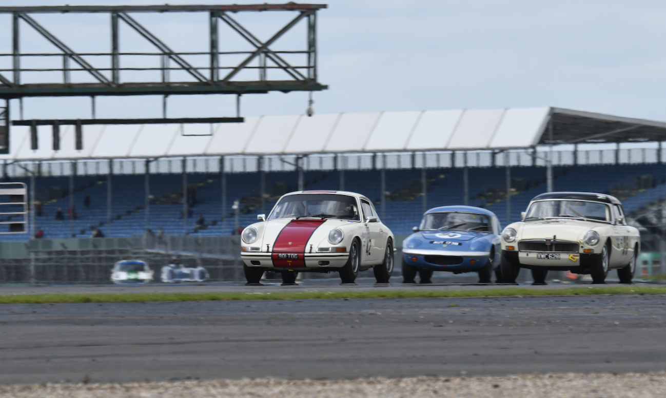 Further down the order Michael and Richard Squire’s rumbustious Listerdeveloped Sunbeam Tiger Le Mans sat mid-grid where Ward was separated from Bourne by Neil Merry’s conventional Tiger and the closely-matched Porsche 911s of Peter Tognola and Steve Jones. The MGB posse was an all-family affair, with the Morley, Jacobsen, Lambert and Phillip cars mixing it with the similarly-powered Gilbern of Bob and Sam Binfield. Paul and Ewan Bason’s Lotus Elite was the only GT1 taker on the high-speed 3.63-mile course.