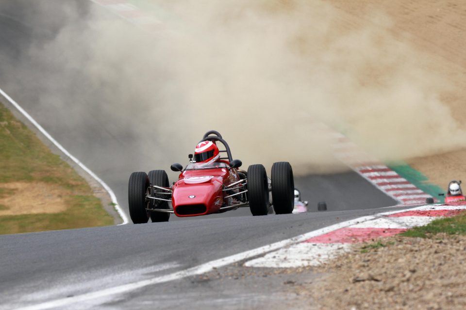 Both Historic Formula 3 Championship races quickly developed into two-way tussles between Jon Milicevic (Brabham BT21B) and Andrew Hibberd (Brabham BT18). Eventually the score was one-all as each driver hit problems in one of the races. Hibberd was slowed by a carburettor problem in the first race and Milicevic was sidelined by a broken rocker in the second race, which brought his 2018 winning sequence to an end.