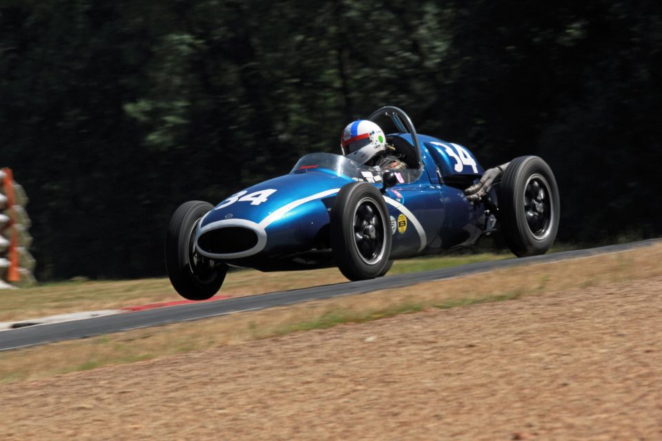 Chris Goodwin scored a first Formula Junior win in his Lotus 22 as a safety car period helped him edge away from Peter Morton’s Lightning Envoyette. When Morton was boxed behind a lapped car at the re-start, the matter was put beyond doubt. Peter de la Roche completed the podium while Andrew Tart (Bond) led the front-engined cars.