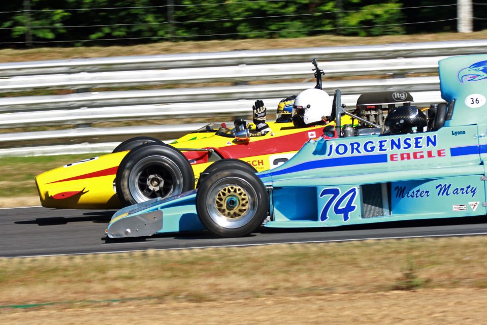 Michael Lyons was one of several double winners, with a commanding brace of victories in the Derek Bell Trophy in his Lola T400. While Lyons set a stunning pace at the head of a bumper field, a fine contest for second raged in both races and thrilled the fans as the Formula 5000s of Neil Glover (Chevron B37) and Greg Thornton (Surtees TS11) battled mightily with Mark Charteris (F2 March 742) and Matt Wrigley (F Atlantic March 79B). Eventually, Glover and Thornton took a second place each as Charteris headed the 2-litre cars and Wrigley twice topped an encouraging contingent of ten Formula Atlantic cars.