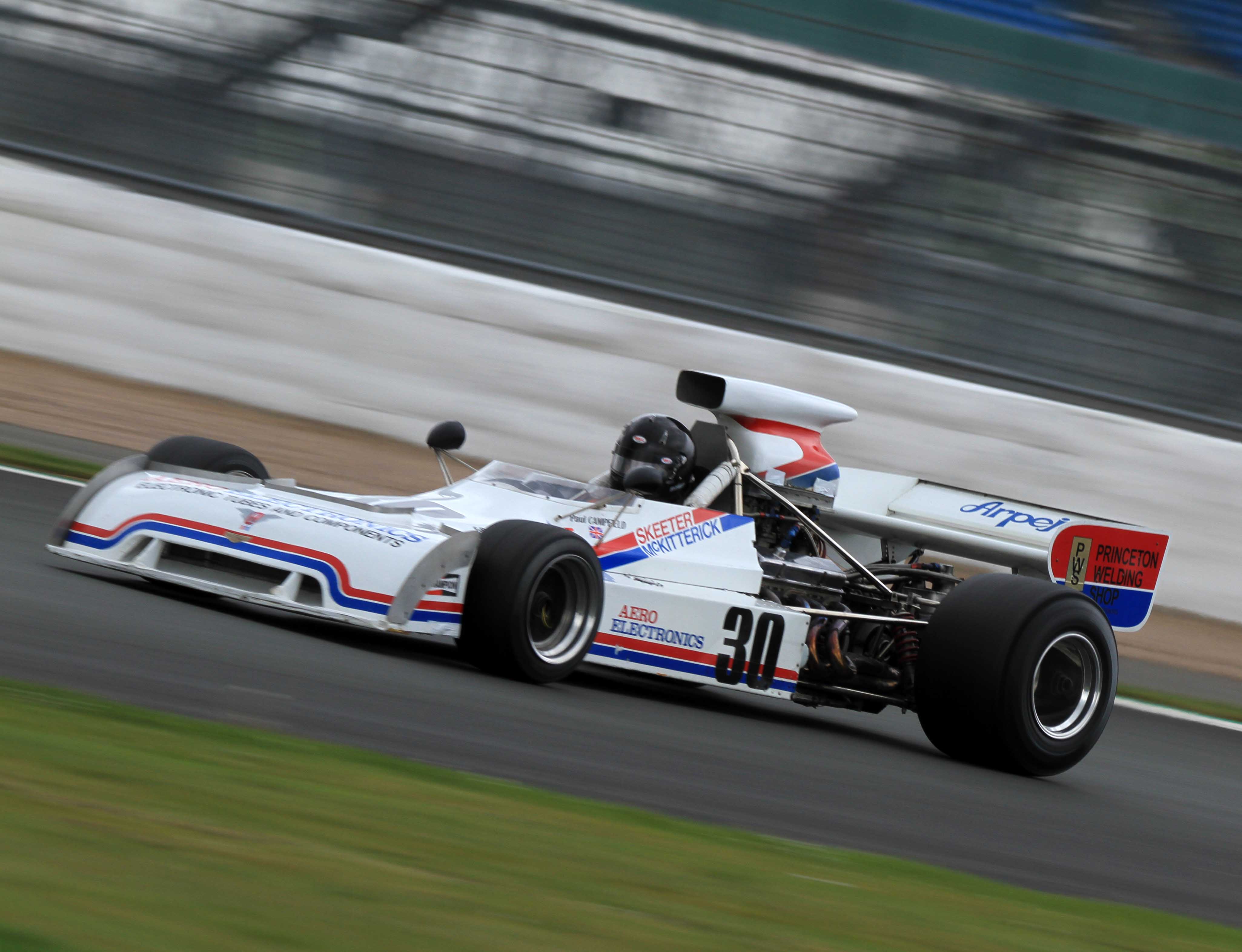 Before the weekend, Marc Campfield had never driven a Formula 5000 car but in the pair of XL Aurora Trophy races he took his father’s Chevron B24 to a brace of wins. Other than a spin on oil in the second race, the Austin Healey racer barely put a wheel wrong. Jamie Brashaw (March 73A) gave valiant chase despite on-going fuel and gearbox issues and led the second race after Campfield spun, only to grind to a halt with three laps to run just as Campfield battled back into contention.