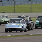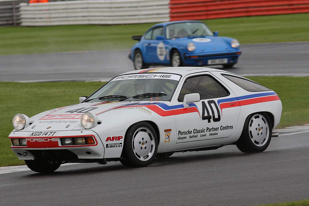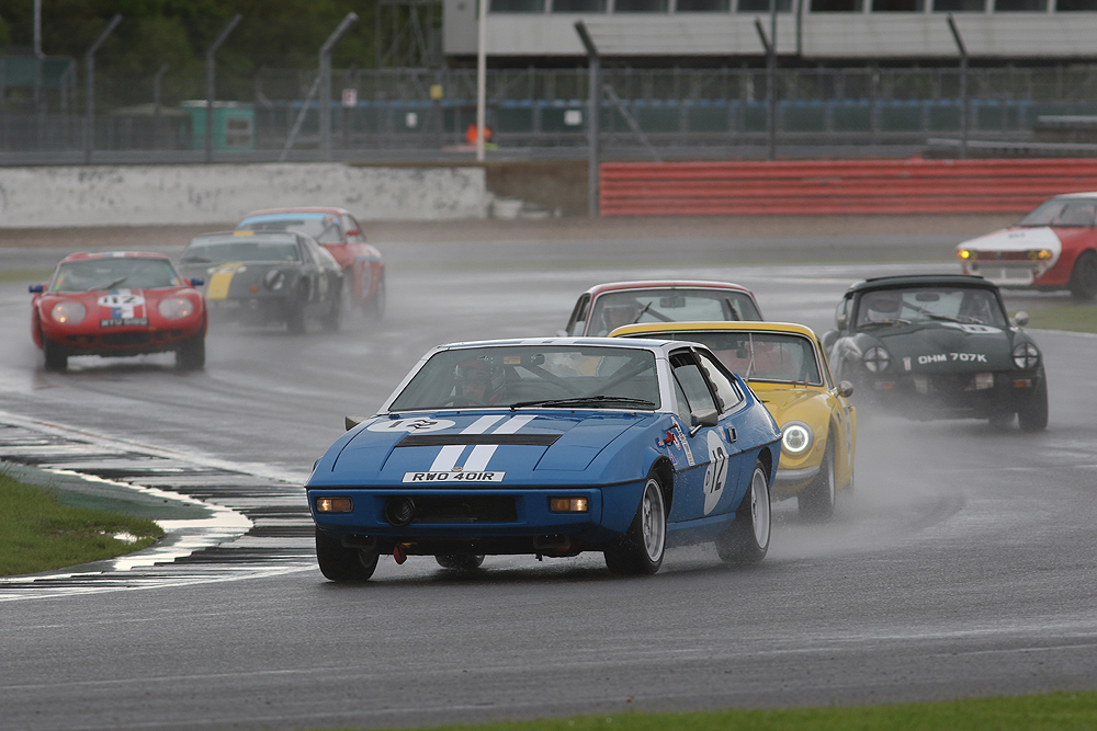 Julian Barter’s Lotus Elan splashed to 70s Road Sports victory in Saturday’s rain as his father Charles (Datsun 240Z) led the pursuit. However Barter had to defend over the closing stages as racing legend Richard Attwood came through to a fine third in the Porsche 928 entered by Porsche Cars GB to honour the model’s 40th anniversary.