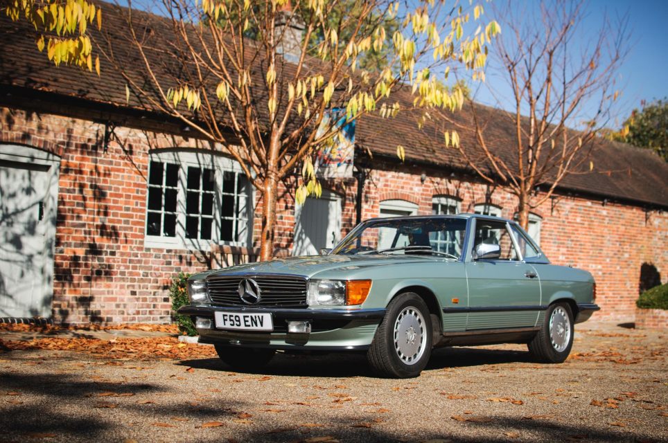 1989 Mercedes-Benz 300SL (R107) on offer is delightfully finished in Thistle Green Metallic with a matching interior and factory hardtop. Having covered just 54,000 miles, estimated at £30,000 to £35,000.