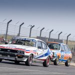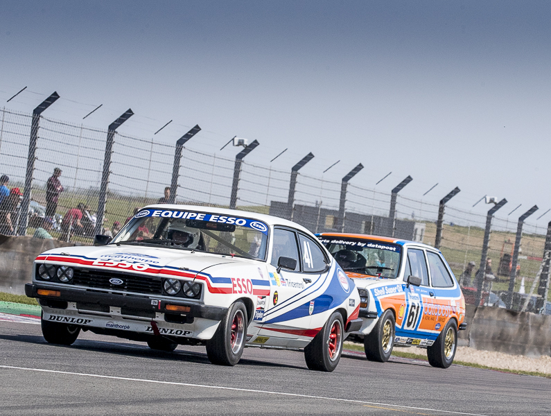 Alex Thistlewayte’s bold blue Chevrolet Camaro was the first home in the Tony Dron Trophy but in Invitation Class, followed by Patrick Watts’ who officially won the Tony Dron Trophy in his Frank & Jeans Ford Capri recently repaired since Goodwood.