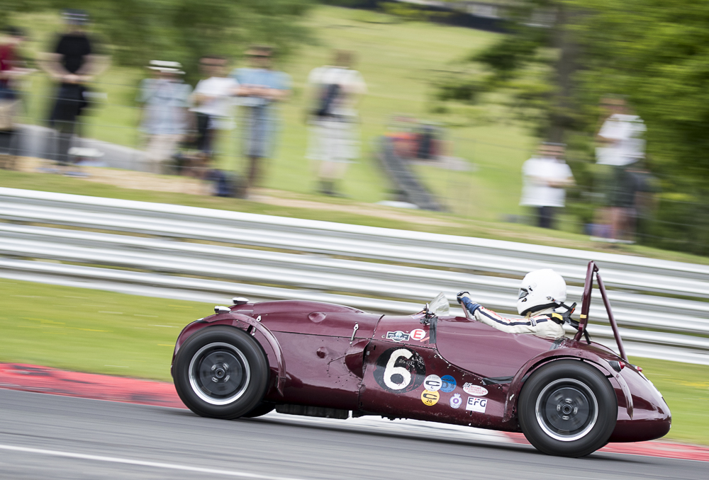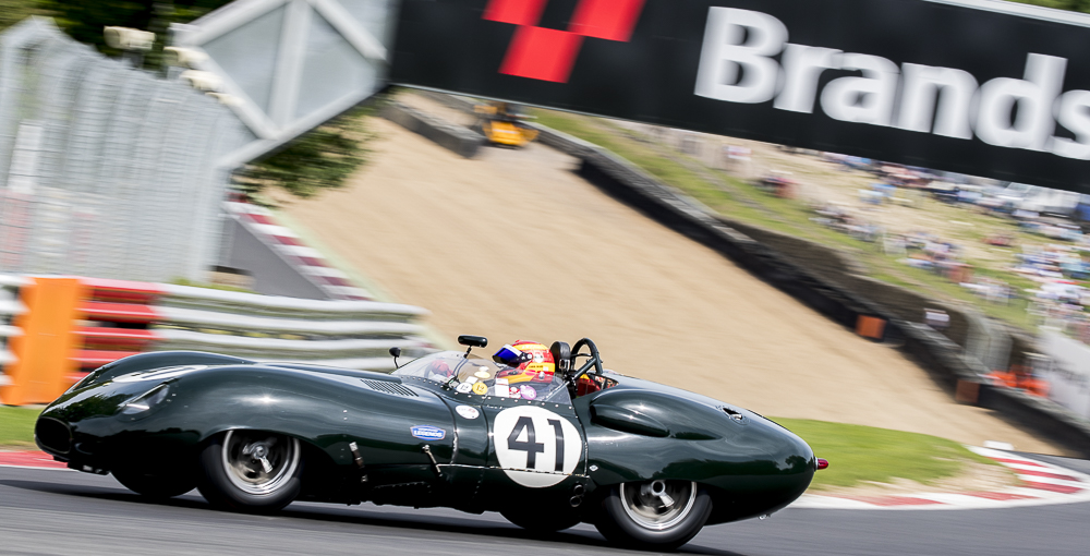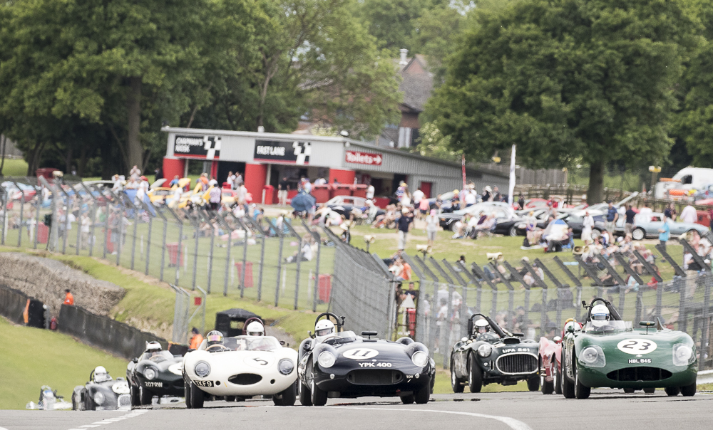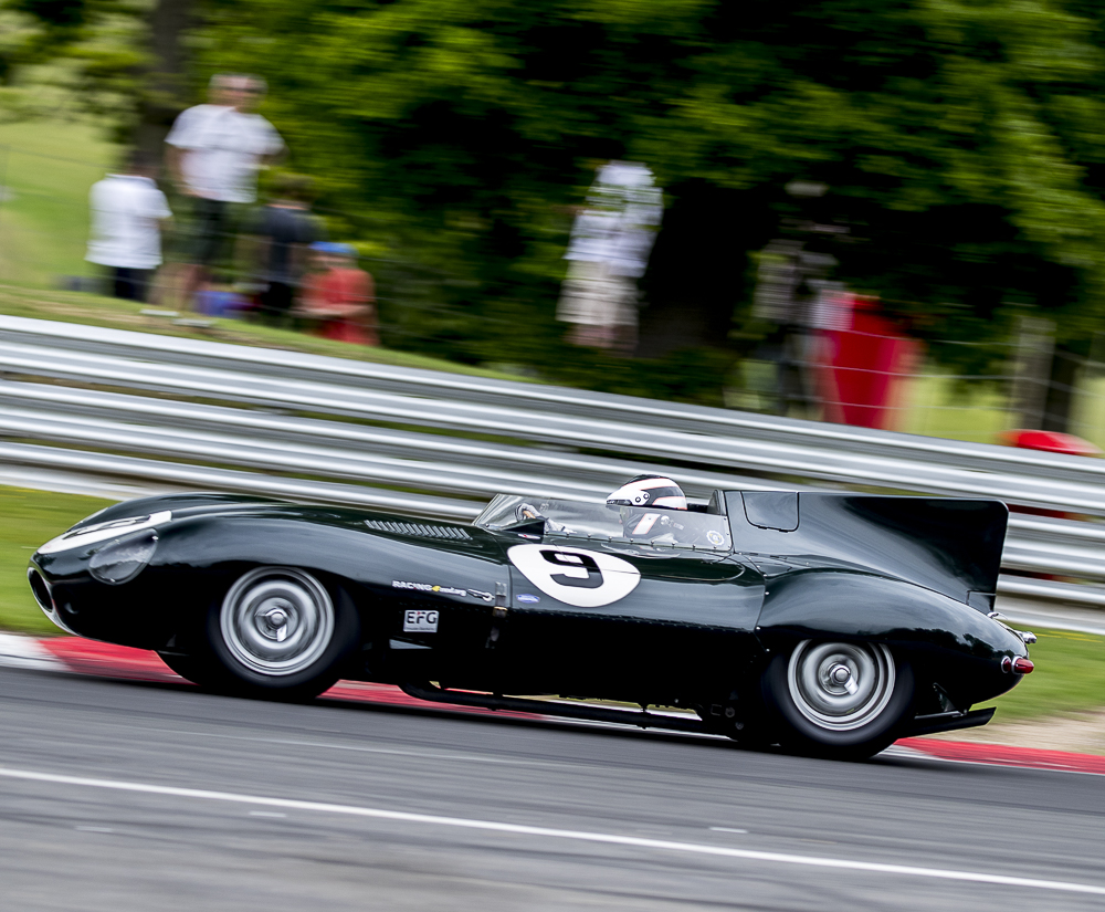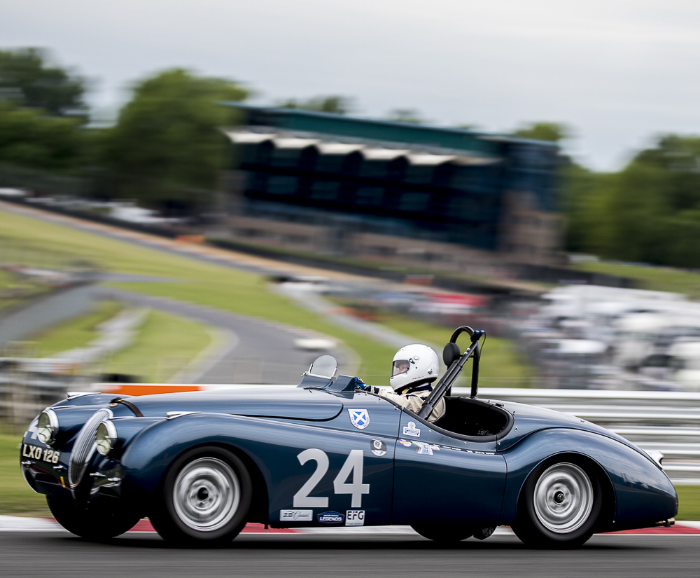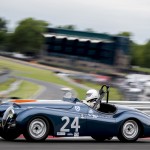 The Royal Automobile Club Woodcote Trophy race narrowly escaped a monsoon storm which arrived as the chequered flag dropped. Will Nutthall took the lead off the line, before losing a spinner at Paddock Hill bend – then the wheel it was attached to – at Surtees, in the RGS Atalanta. Again thankfully both car and driver were all OK. This left the road clear for the Lotus Mk X of Bourne/Paul to lead the race in the early stages but it was Blakeney-Edwards/Gillett who took the lead in Fred Wakeman’s Cooper T38 in the final part of the race to secure the win. The Jaguar D-Type of Karl Jones and Ben Eastick climbed the field to finish 2nd ahead of the Cooper Bristol T24/T25 of John Ure/Nick Wigley who finished third after an incredibly tight finish between them and the Lotus X. Paul/Bourne had to settle for 4th with just 0.2 secs seconds behind and Jonathan Abecassis’ drove a faultless race to finish 5th overall in his Healey 100/4.