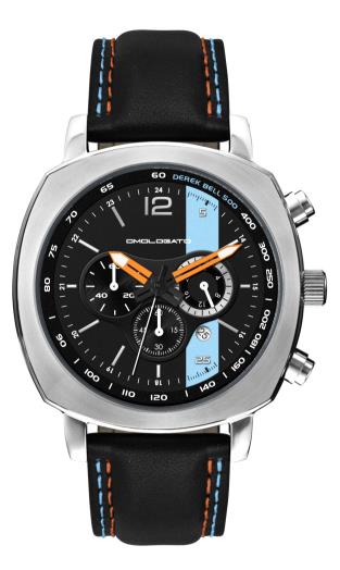 With a leather strap featuring orange and light blue stitching and a light blue strip running through the 45.5mm face, the famous image of the GR8 is captured perfectly by the Derek Bell 500, which will be in stock from March 2017.