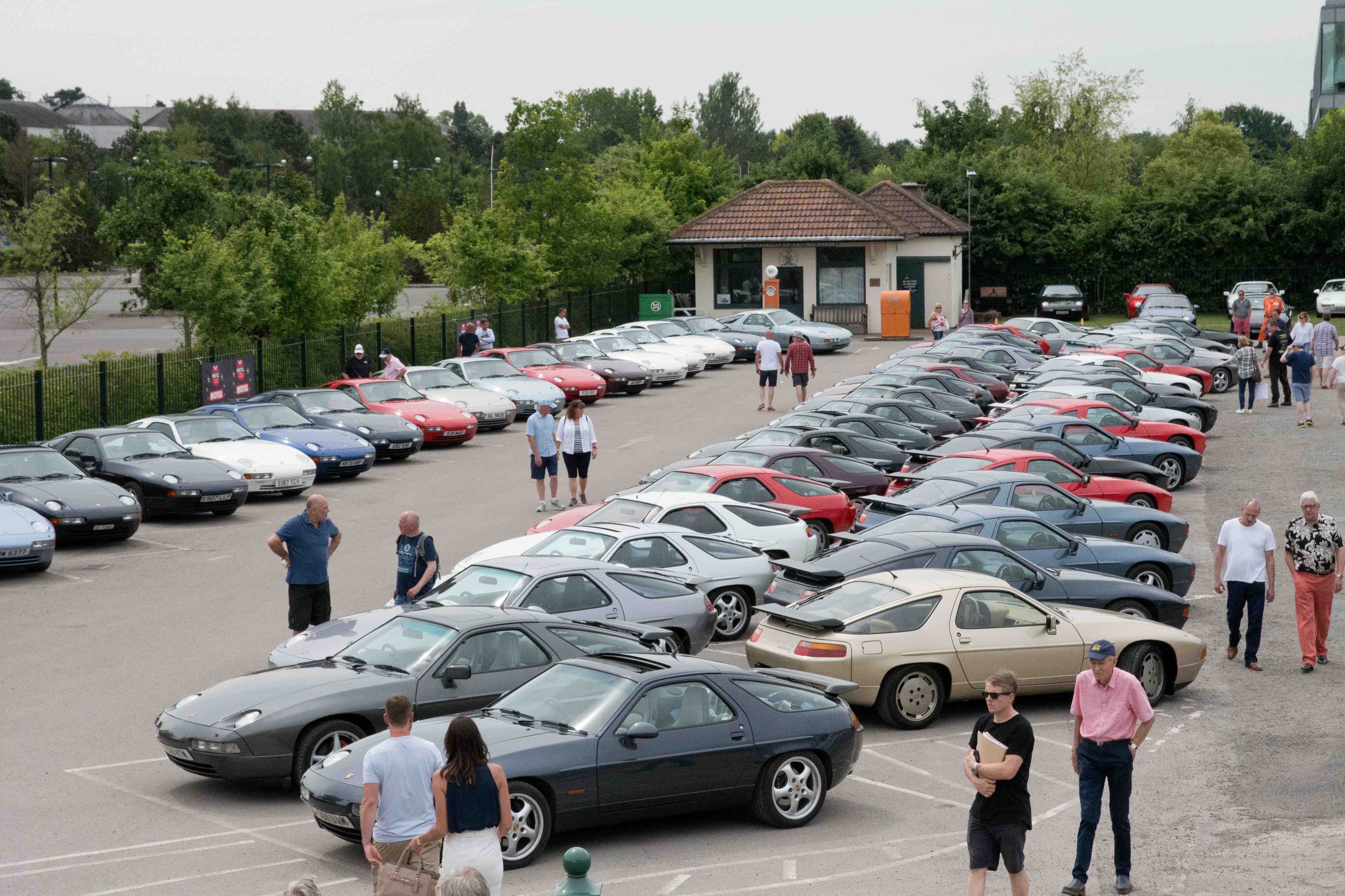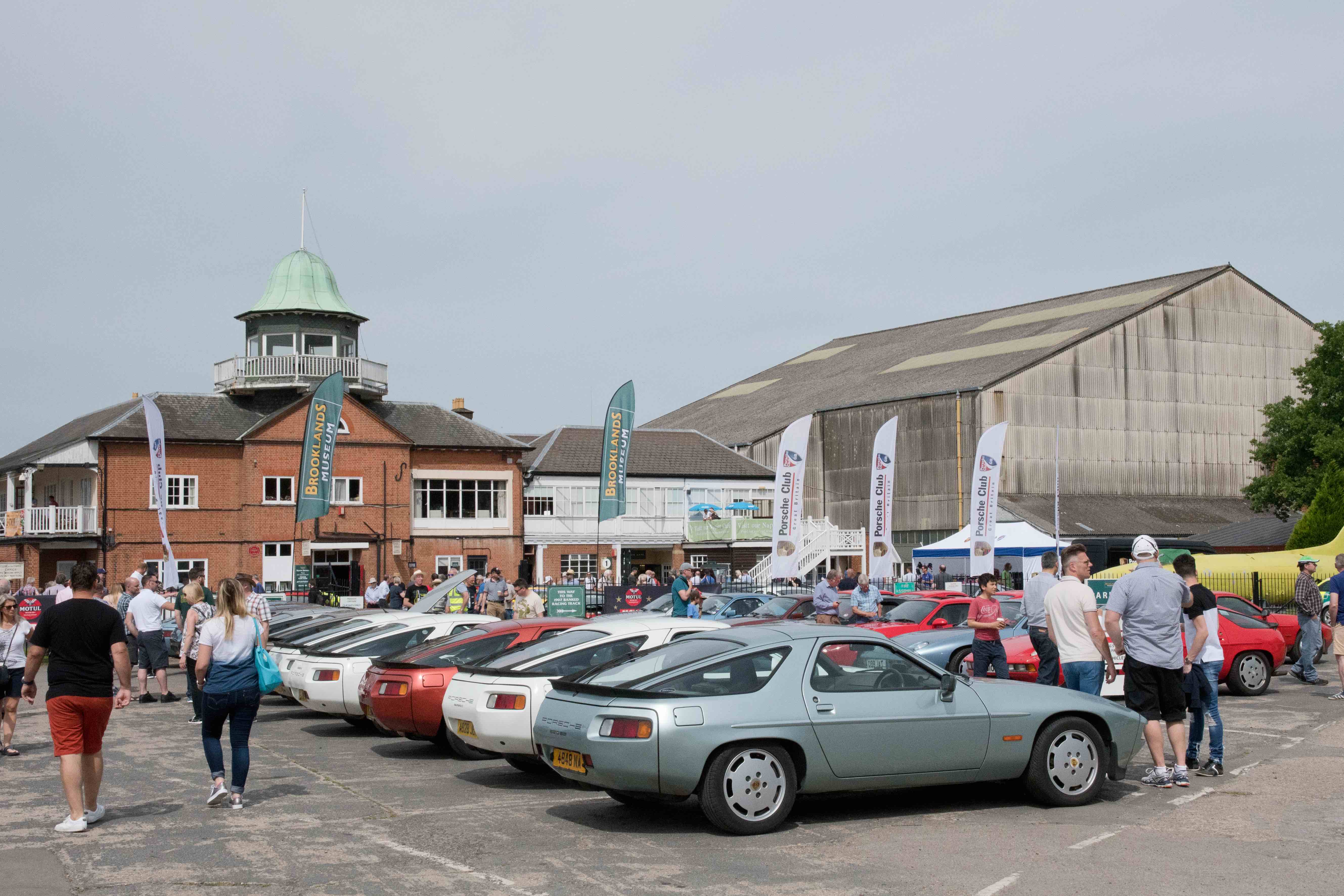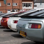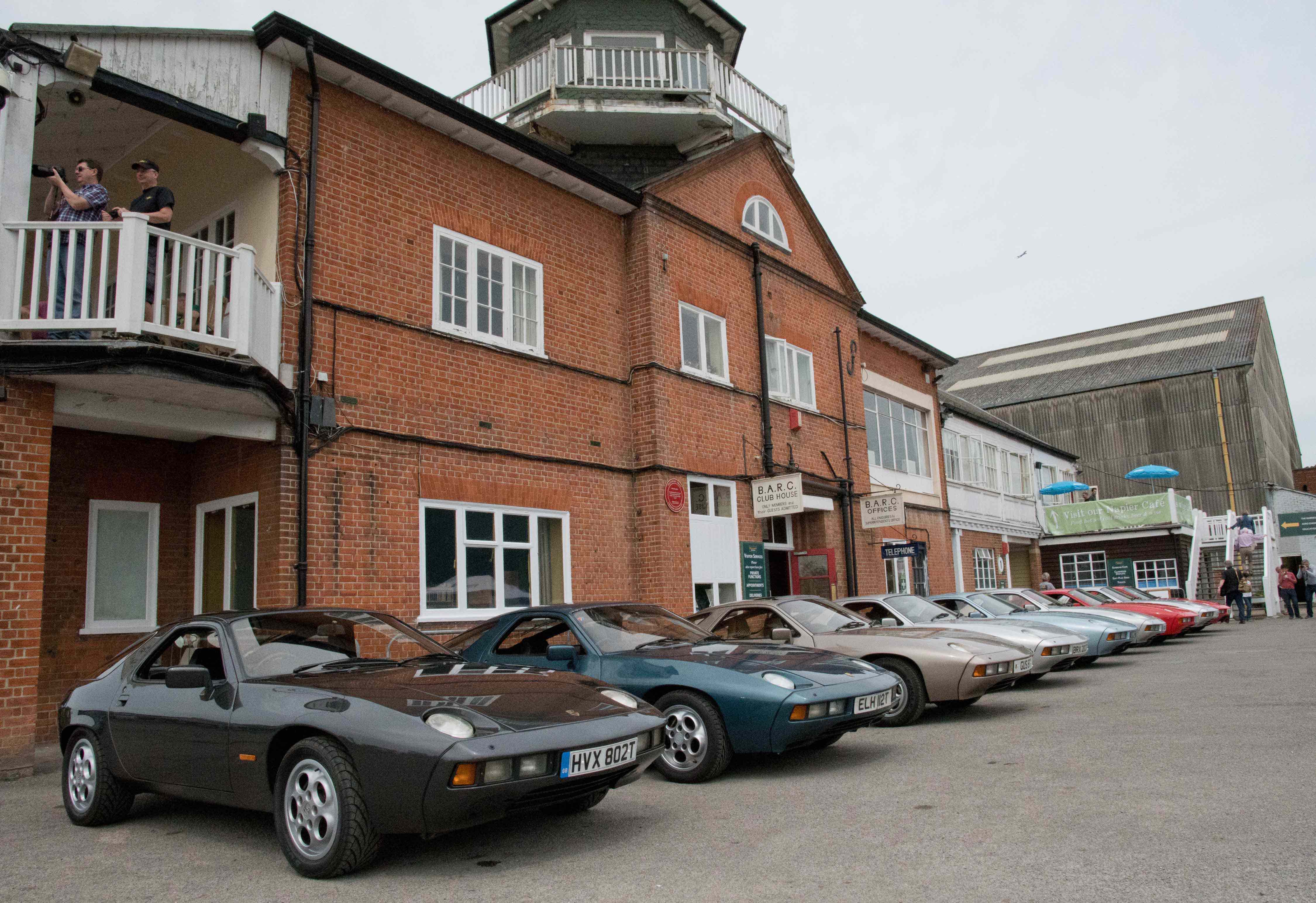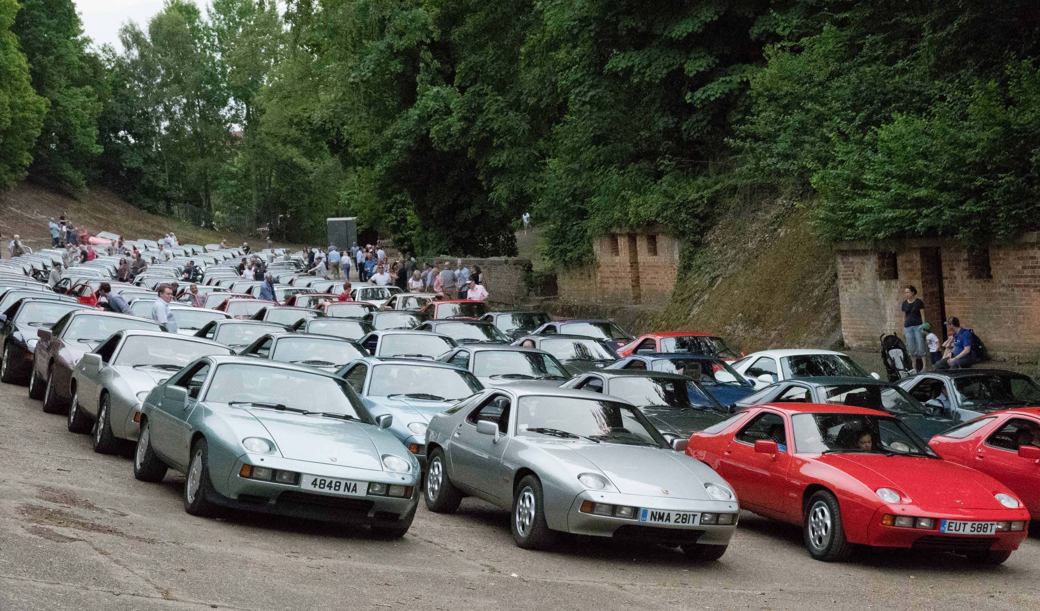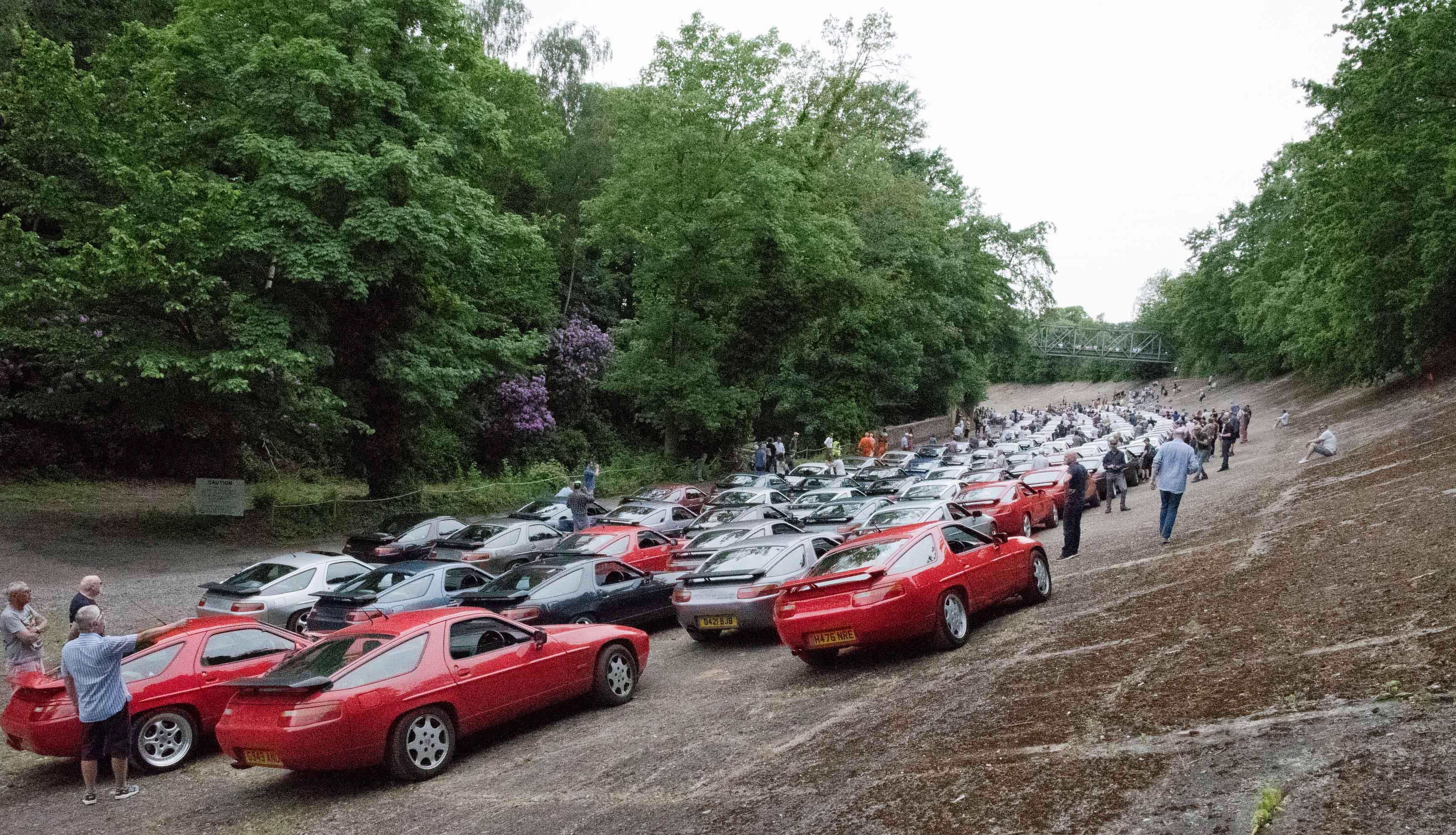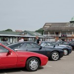 On Sunday 28th May a record number of Porsche 928 cars arrived at Brooklands Museum to celebrate the marques 40th Anniversary. The earliest models of the car were lined up in front of the Club House and in the afternoon around 150 Porsche 928’s were parked own the historic Brooklands Banking for a photo shoot. The event was organised by Porsche Club GB