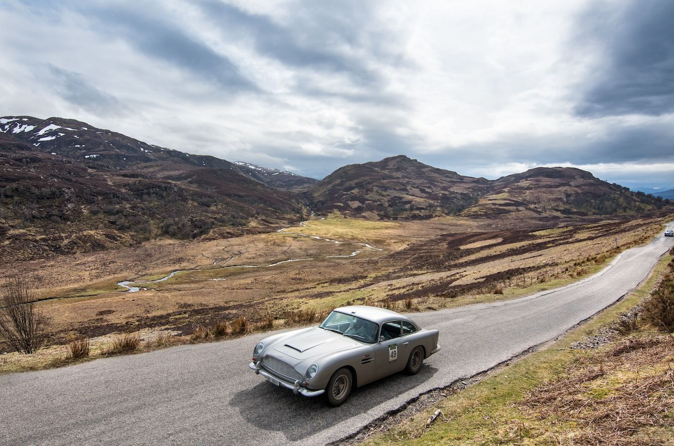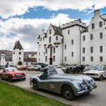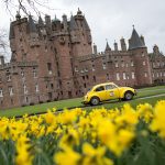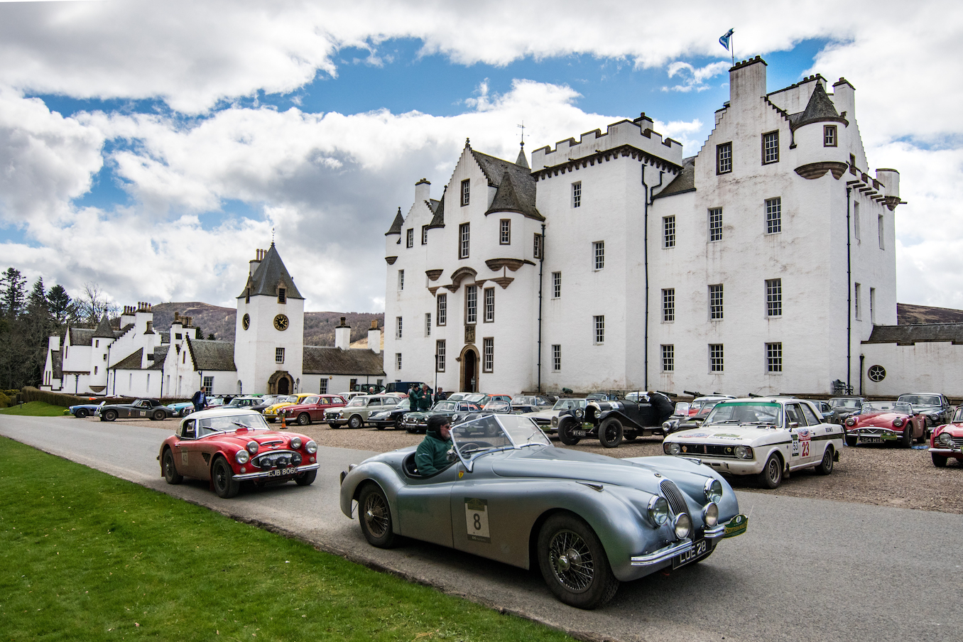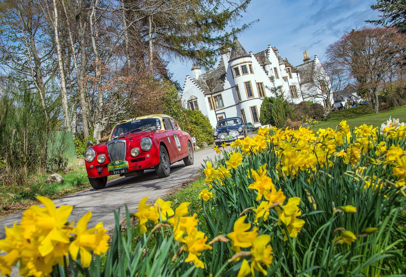 77 cars started day four tackling the opposite side of Loch Ness, amongst the impossibly tall conifers, winding single track roads, Kincraig Castle for lunch and more distillery visits on the schedule, including Glen Ord, Glenmorangie and Balblair.  A wondrous drive past the Struie Hill Viewpoint, one of Scotland’s finest, above the Dornoch Firth and a short regularity on the edge of the northerly Sutherland Mountains marked the turn south-wards before heading to Balnagown Castle, the Scottish home of Mohamed Al Fayed, surrounded by fields of yellow daffodils, for a test where the marshals saw the cars  scattering in any directions around the cones to find the right way to the finish line.