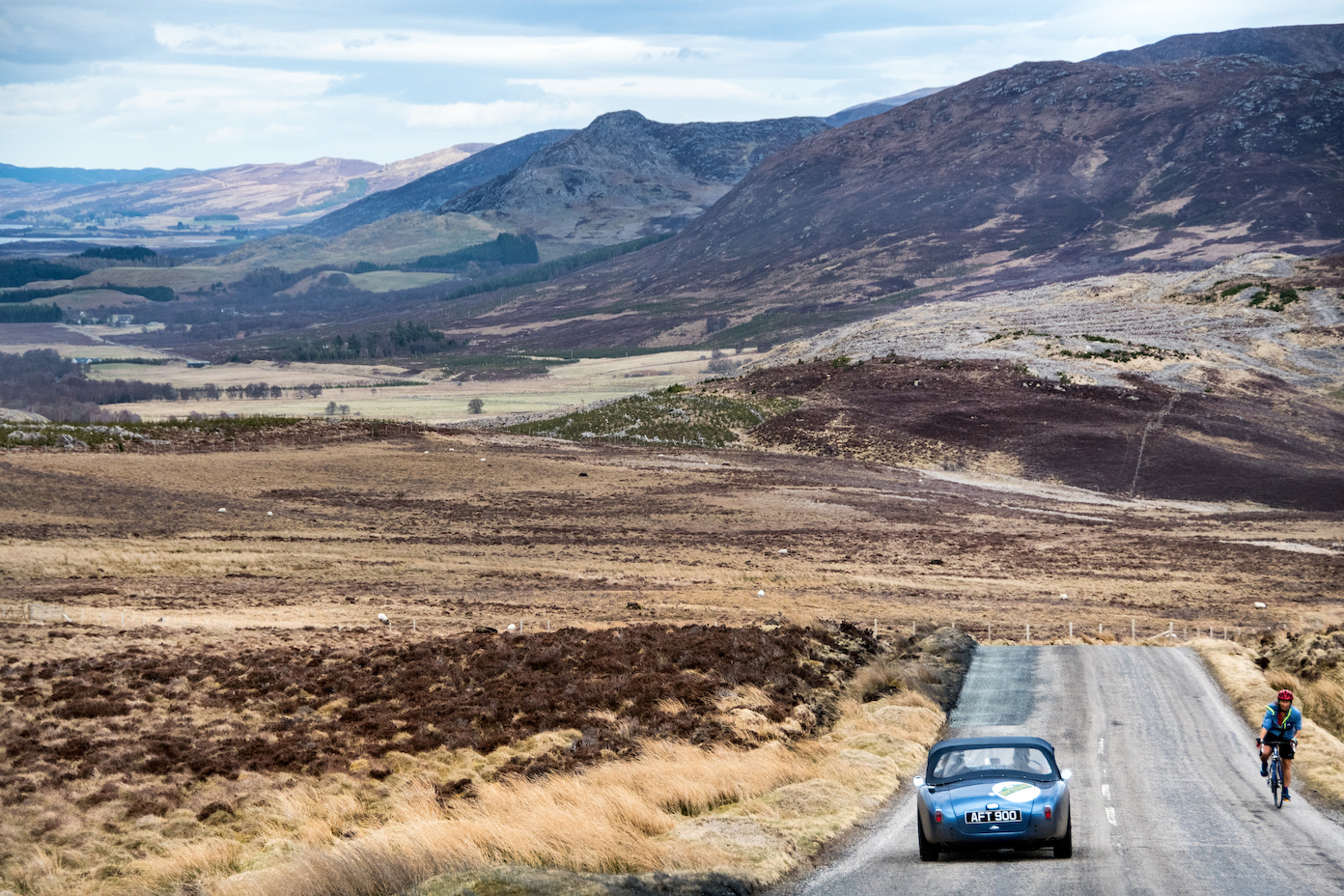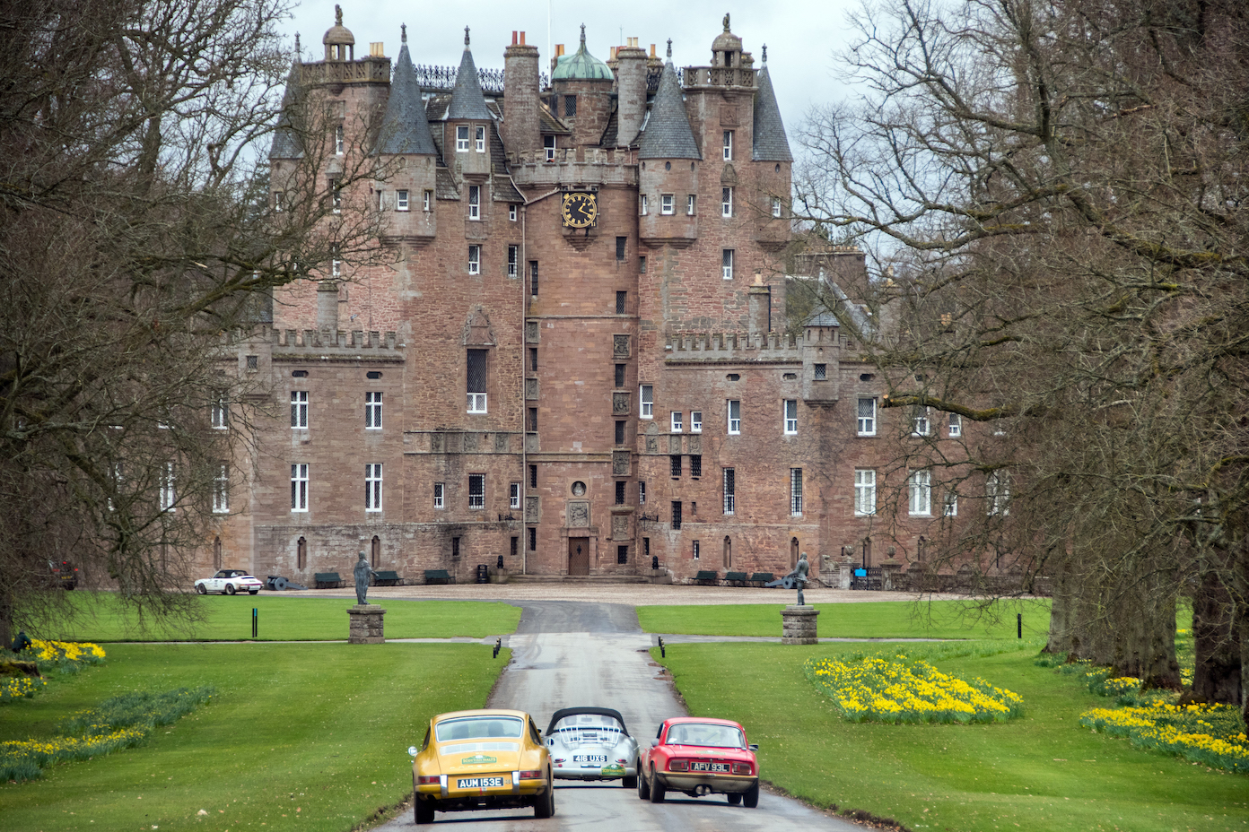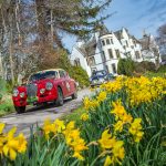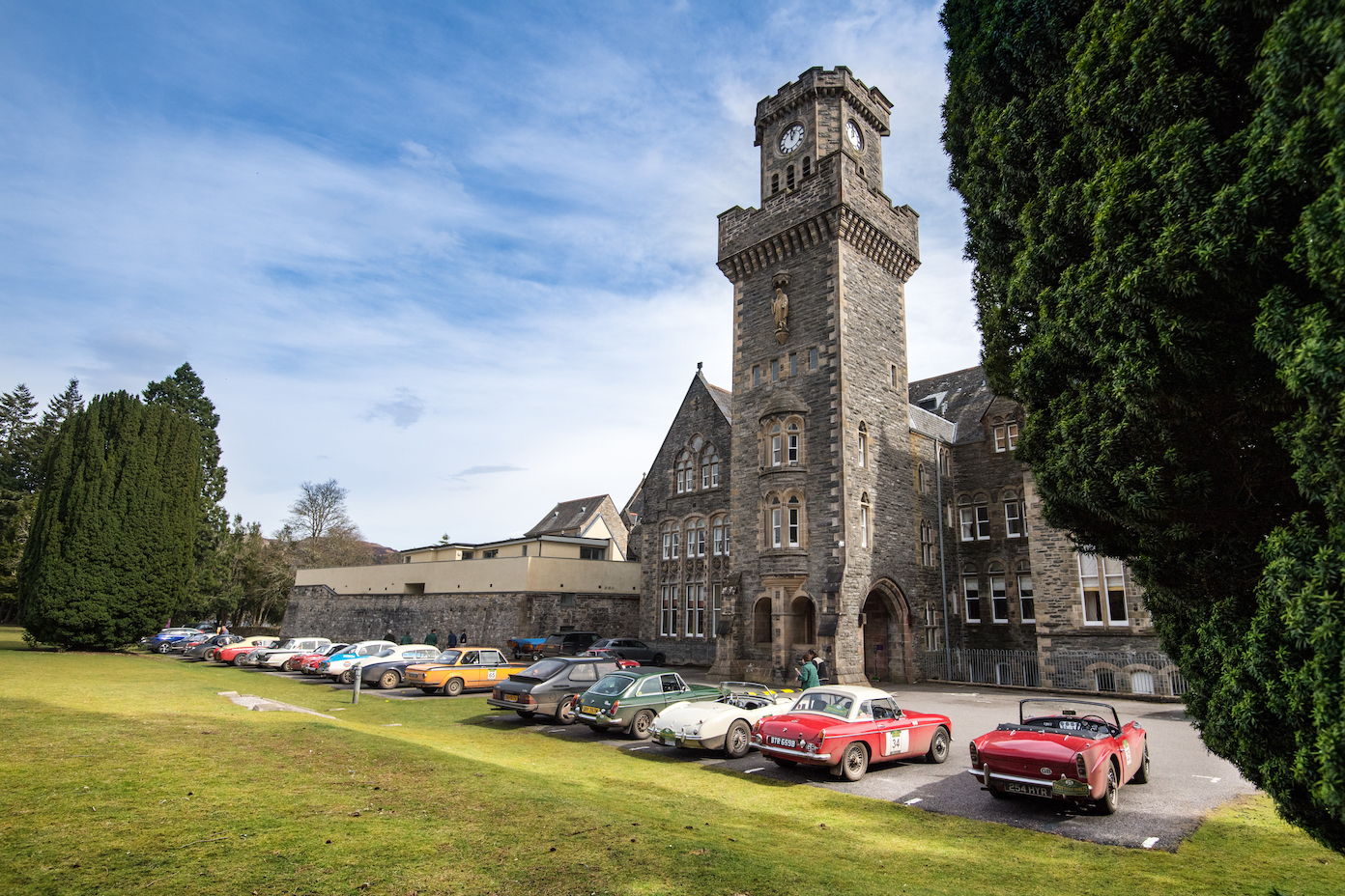 77 cars started day four tackling the opposite side of Loch Ness, amongst the impossibly tall conifers, winding single track roads, Kincraig Castle for lunch and more distillery visits on the schedule, including Glen Ord, Glenmorangie and Balblair.  A wondrous drive past the Struie Hill Viewpoint, one of Scotland’s finest, above the Dornoch Firth and a short regularity on the edge of the northerly Sutherland Mountains marked the turn south-wards before heading to Balnagown Castle, the Scottish home of Mohamed Al Fayed, surrounded by fields of yellow daffodils, for a test where the marshals saw the cars  scattering in any directions around the cones to find the right way to the finish line.