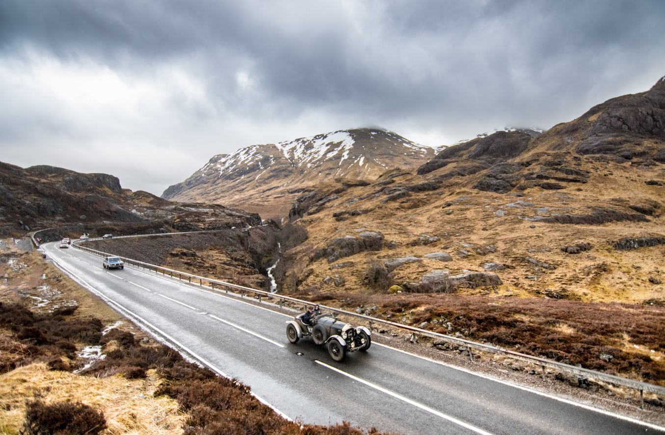 The trek northwards on Day 3, the most picturesque of the event, began with some regularities on narrow roads along beautiful rivers and lakes, followed by a test in the Edinchip Estate and a coffee stop at the well known Killin Hotel, where everybody could marvel at the Falls of Dochart, as the melting snow contributed to raise the water levels. The run after coffee took the crews along the A82 and after an old Malts favourite, The Glen Orchy regularity, the run up started through the dramatic and imposing scenery of The Glencoe Pass: mountains covered by snow and shrouded in mist, lakes like mirrors and lattices of tiny gravel roads, included the Glen Etive road, where James Bond’s Aston Martin DB5 was upstaged by the view in the 2012 James Bond film “Skyfall”. All of a sudden, two R.A.F. Typhoons ripped the sky and broke the sound barrier, guiding the last on the road to the lunch at the Ballaculish Hotel, situated in a breath-taking lochside setting at the foot of Glencoe. An iconic test through the whiskey barrels took place at the Ben Nevis Distillery, one of the oldest licensed distillery in Scotland dating back to 1825, nestling at the foot of Ben Nevis, Britain’s highest mountain at 4,406 feet above sea level. As we headed to Inverness, the strains and rigours of the previous days were taking their toll with a number of crews finding themselves parked up on the side of the road, needing assistance from the HERO assist on event service crew. Unfortunately, we would also see the demise and retirement of Paul Bloxidge and Ian Canavan, who had worked their way up to second overall: the Porsche 911 would drop a cylinder, making it virtually impossible to get up some of the steep hills of the day. The legendary Loch Ness Monster Regularity and the absolutely spectacular Suidhe Viewpoint preceded the descent to lower grounds and into the heart of old town Inverness, the Capital of the Highlands.