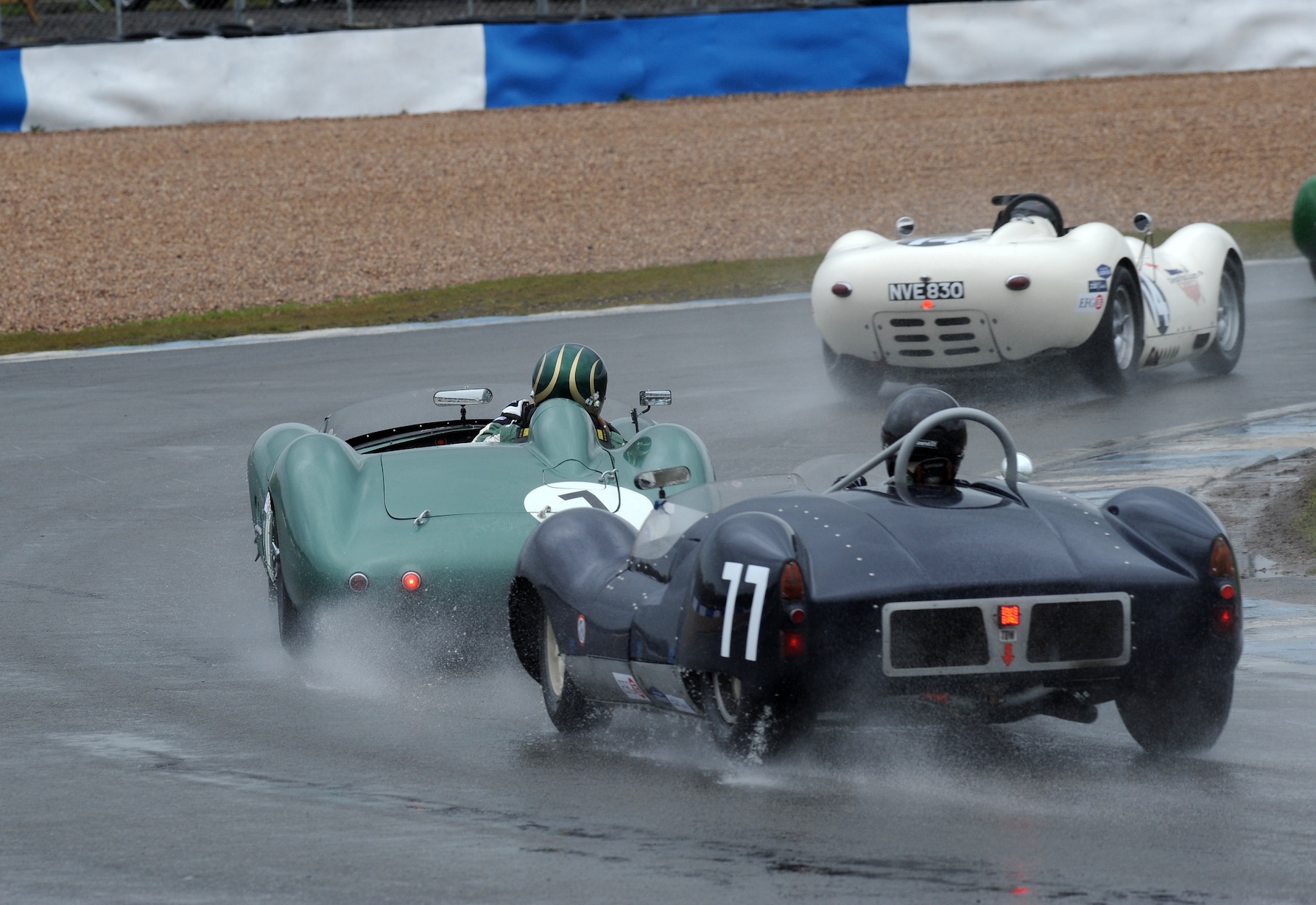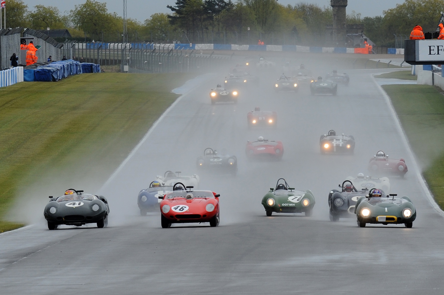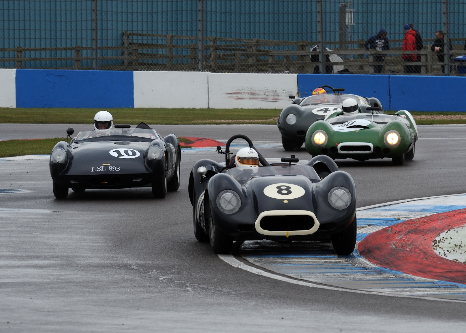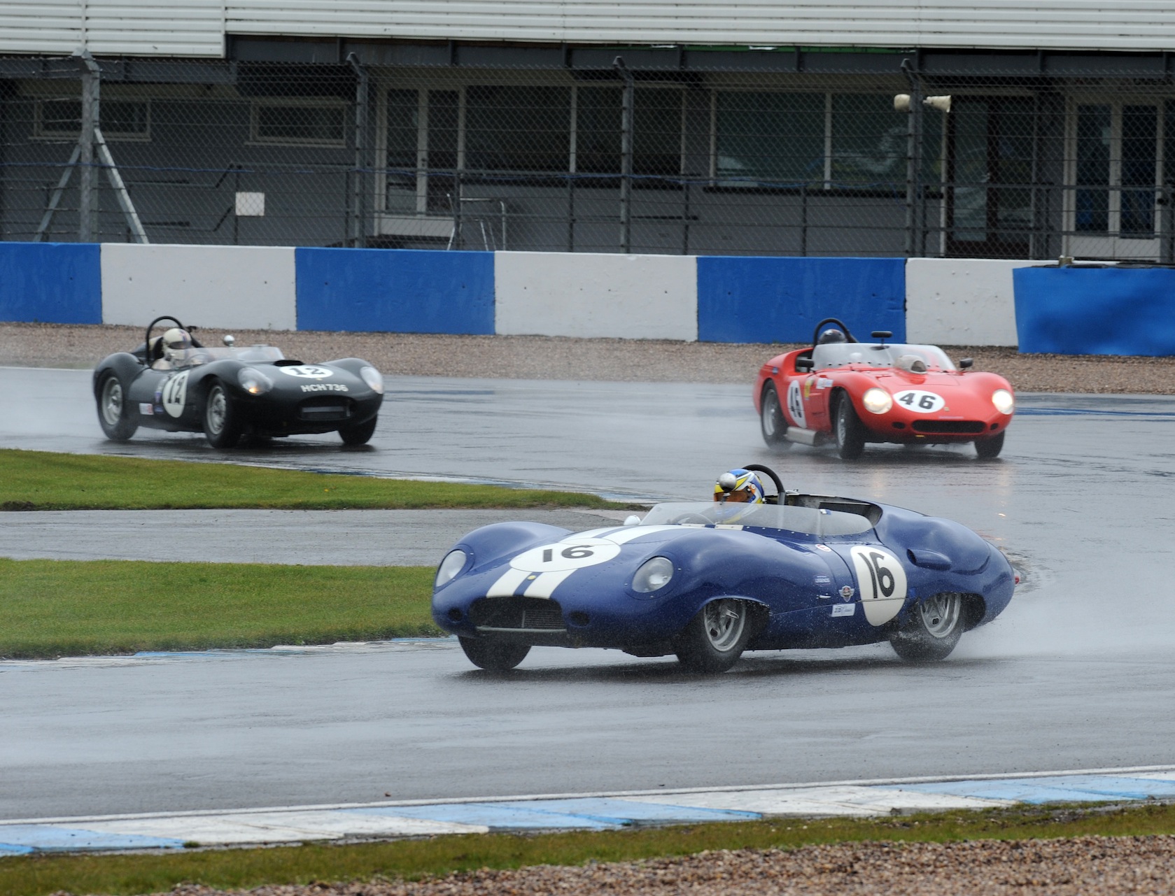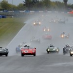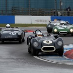 The rain returned with a vengeance for Monday morning’s Stirling Moss Trophy race, where pole sitters Bobby Verdon-Roe and Gregor Fisken sat in the stunning Ferrari 246S, but the rain meister Chris Ward took the lead from the start in the JD Classics Lister Jaguar Costin and from there he never looked back. As the sixty-minute race unfolded the track did start to dry out, the slippery conditions caught out a few competitors but without serious incident. It ended as a Lister dominated race with Richard Kent coming in 2nd and the pairing of Tony Wood and Will Nuthall (3rd) blocked out the top three spots leaving the Lotus 15s of Oliver Bryant and Dion Kremer emerging out of the spray to round out the top five.