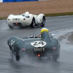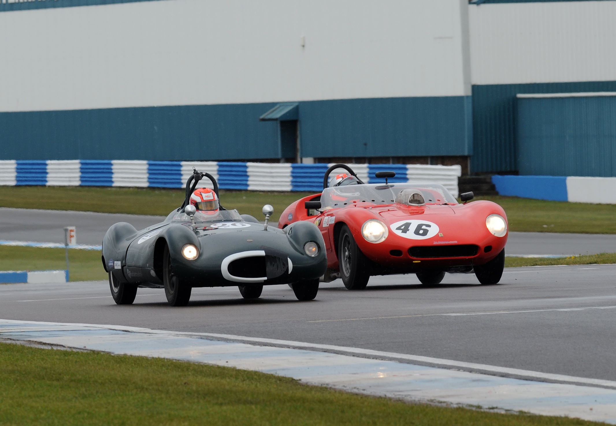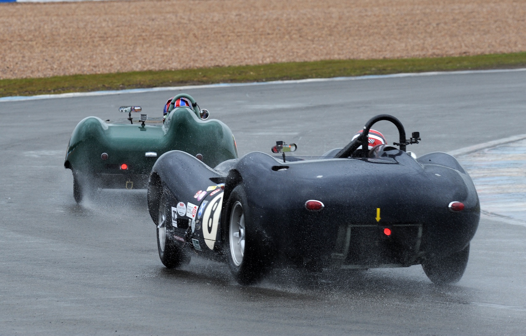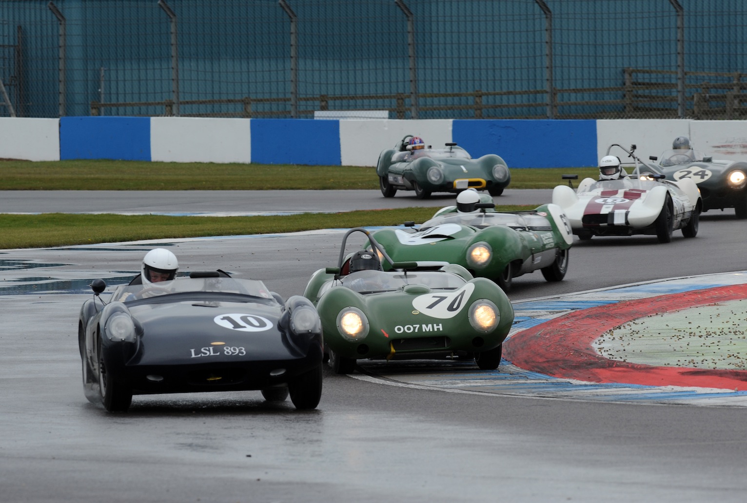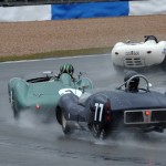 The rain returned with a vengeance for Monday morning’s Stirling Moss Trophy race, where pole sitters Bobby Verdon-Roe and Gregor Fisken sat in the stunning Ferrari 246S, but the rain meister Chris Ward took the lead from the start in the JD Classics Lister Jaguar Costin and from there he never looked back. As the sixty-minute race unfolded the track did start to dry out, the slippery conditions caught out a few competitors but without serious incident. It ended as a Lister dominated race with Richard Kent coming in 2nd and the pairing of Tony Wood and Will Nuthall (3rd) blocked out the top three spots leaving the Lotus 15s of Oliver Bryant and Dion Kremer emerging out of the spray to round out the top five.