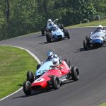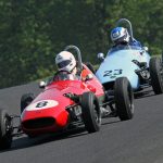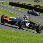 With poleman Jonathan Hughes (Lola Mk2) posting an early retirement, the front-engined Formula Junior race became a repeat of the Donington battle between Ray Mallock (U2 Mk2) and Chris Drake (Terrier). Drake led early on but Mallock then edged ahead to add another victory to his impressive Diamond Jubilee World Tour tally. “Ray’s an exceptional driver,” said Drake who was still contending with the misfire that struck at Donington. By the end of the race, Drake had been caught by Stuart Roach.