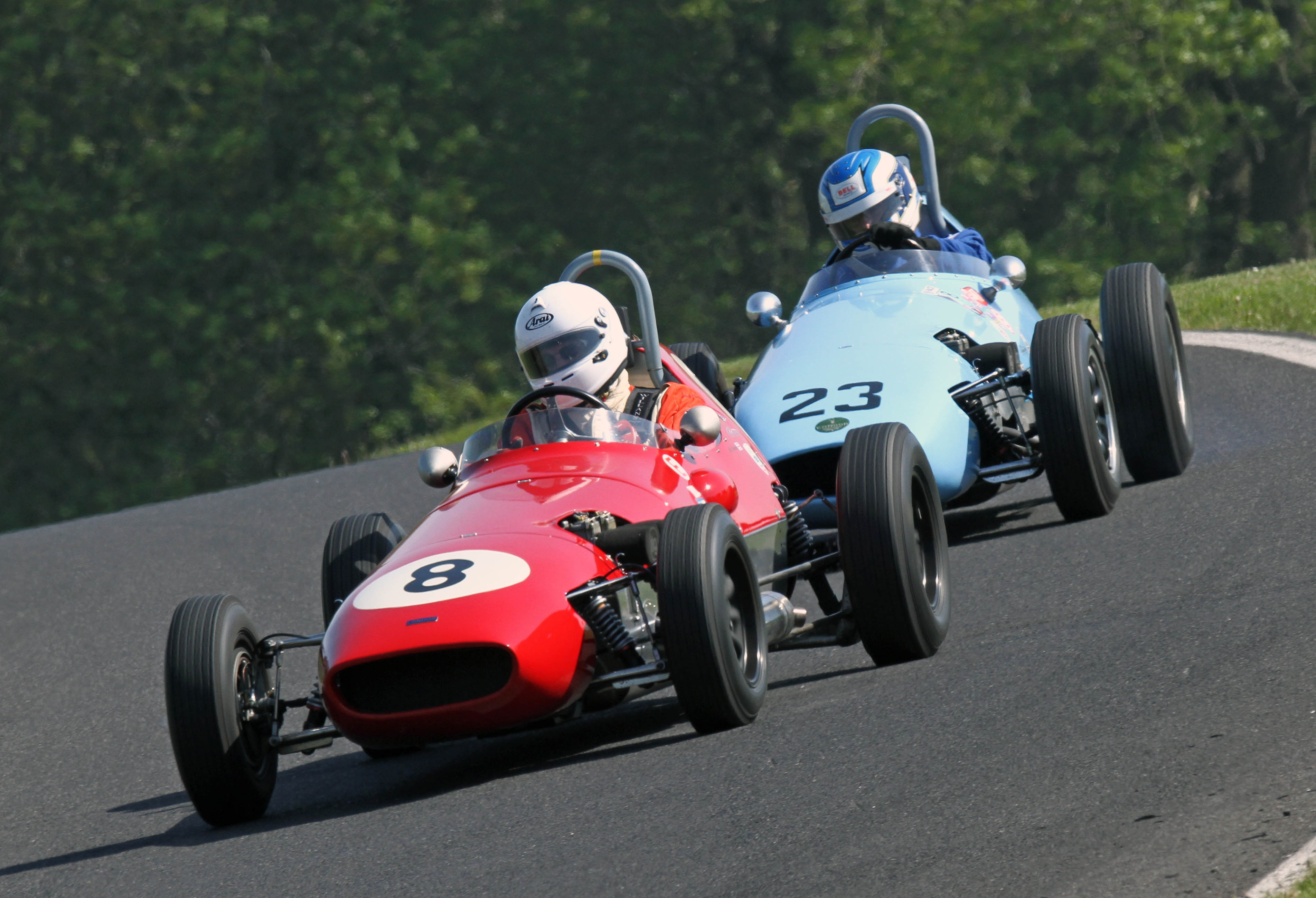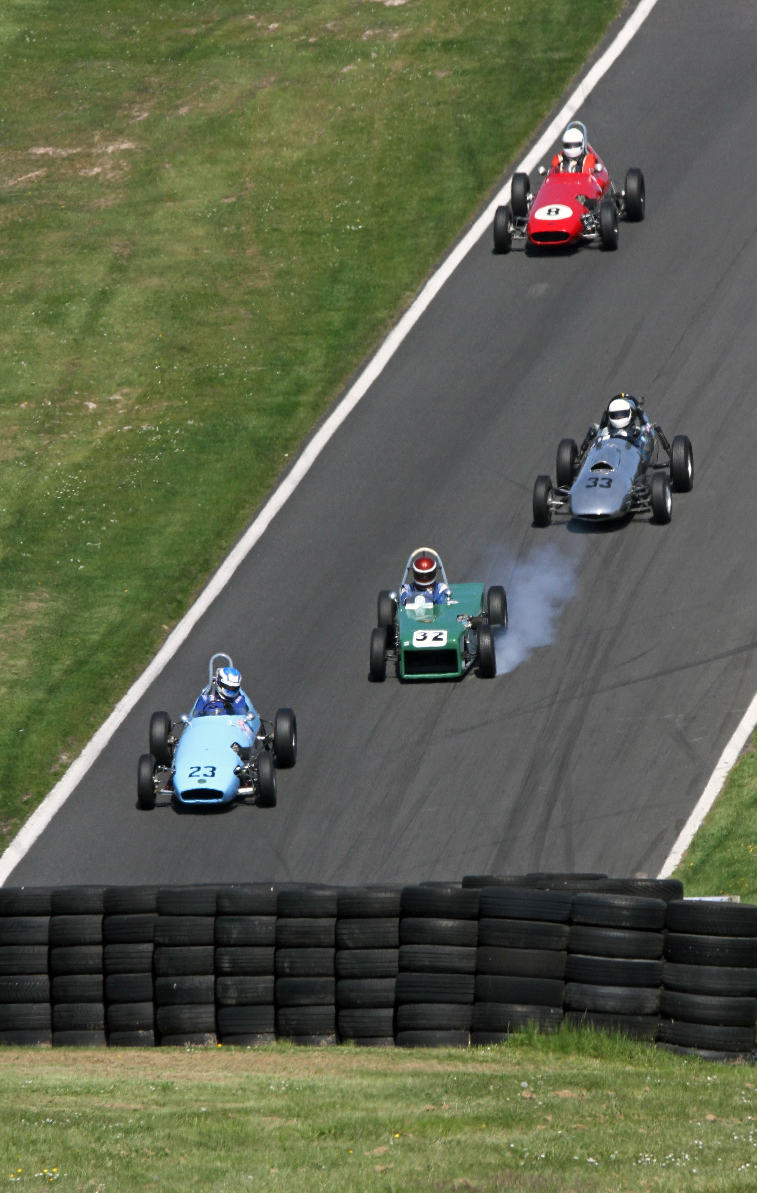 With poleman Jonathan Hughes (Lola Mk2) posting an early retirement, the front-engined Formula Junior race became a repeat of the Donington battle between Ray Mallock (U2 Mk2) and Chris Drake (Terrier). Drake led early on but Mallock then edged ahead to add another victory to his impressive Diamond Jubilee World Tour tally. “Ray’s an exceptional driver,” said Drake who was still contending with the misfire that struck at Donington. By the end of the race, Drake had been caught by Stuart Roach.