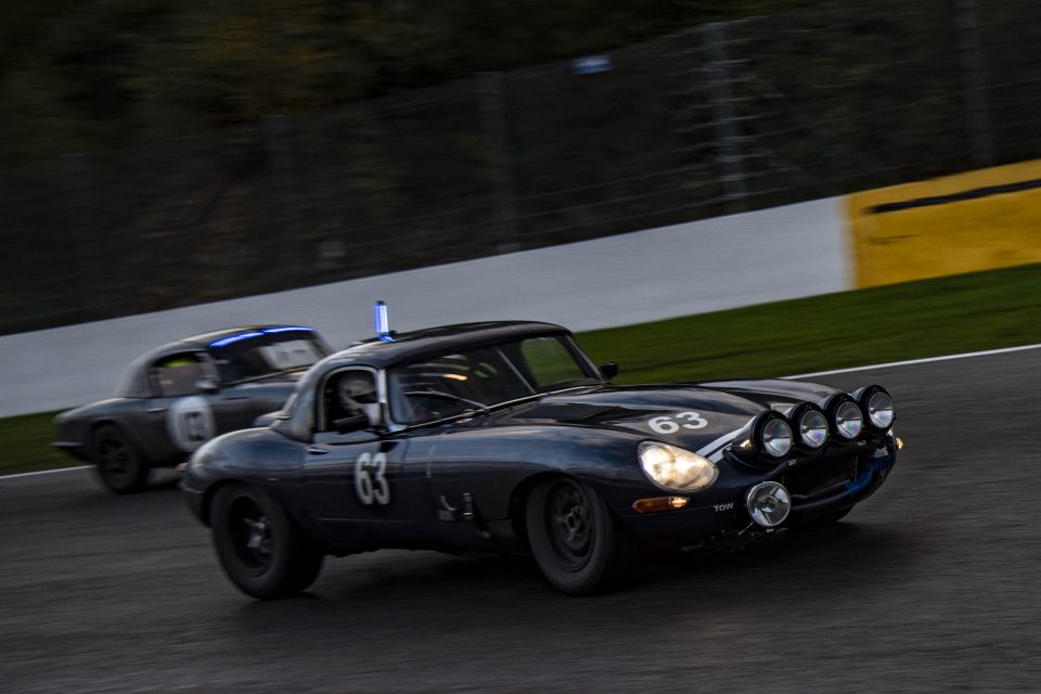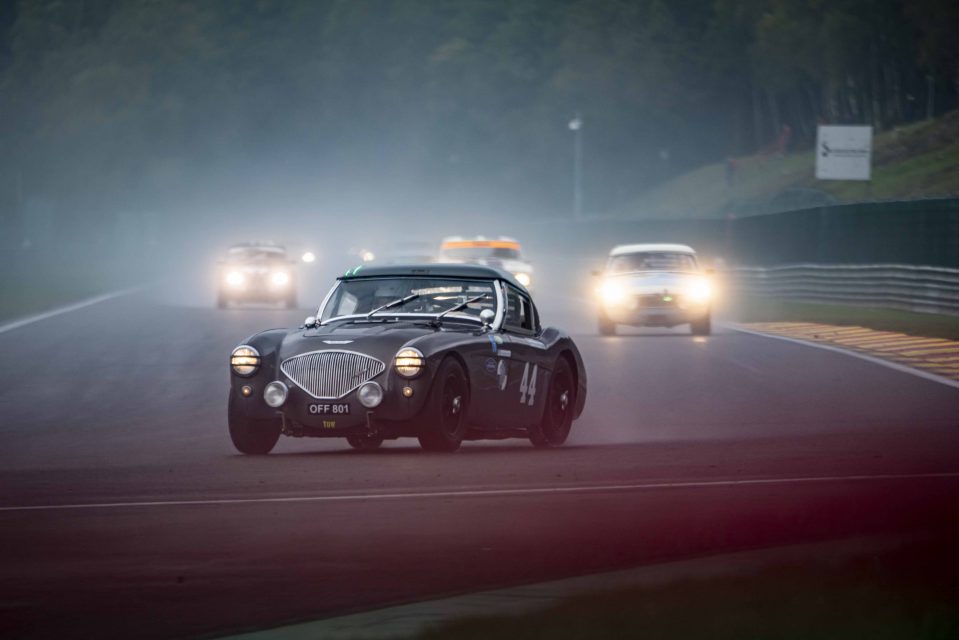 Having qualified 73rd position in the Healey, we made a promising start with Mike at wheel and in the first 2 hours of a very wet race we climbed up to 44th position. Mike commented about the start “The track was just ridiculously slippery, it was pouring with rain and on top of this 100 historic race cars brimming with fuel were sloshing it about on every corner making arriving at each corner rather unpredictable.” “There were people diving off, unable to brake, all over the place, it took a huge amount of concentration to keep it all on the black stuff, coupled with this we were having issues with the Healey’s hardtop which was pouring water into the cockpit and I was trying to stop it taking off.” No surprise then, that the rate of attrition and retirements was pretty high in the first part of the race.