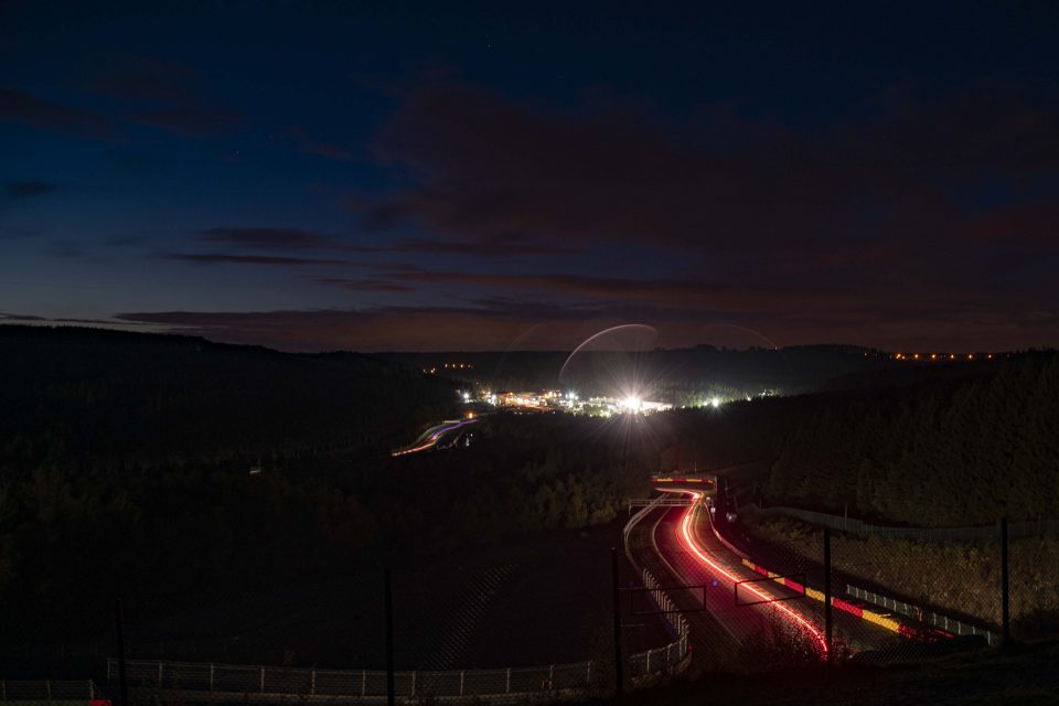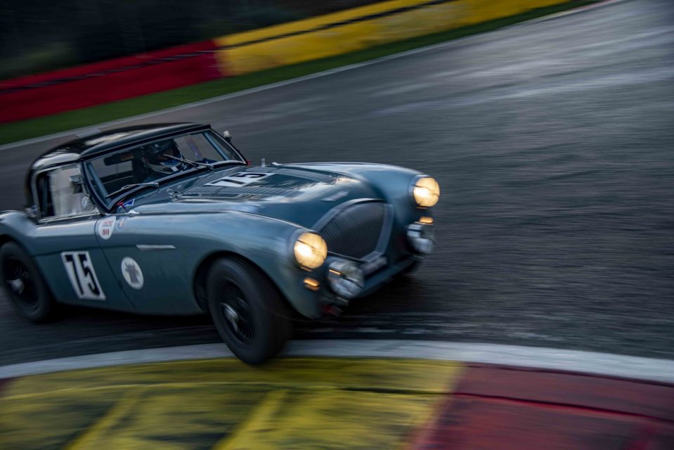 The Belgium Healey crew tired to help but it was Jeremy Welch who came up with the goodies, a spare pulley to get us back on the road, but once the car was fixed and ready to go – the clutch release bearing decided to seize leaving us clutchless. A bump started lap by Toddy got the bearing released and having checked the water pump pulley & raditor were all functioning I was duly strapped in and sent off. The light had faded by this time, and we had slid back down to somewhere like 65th overall. But I didn’t get far, as I climbed Eau Rouge to give it the beans down the Kemmel Straight the Radiator hose must have popped off spewing all the Rad water out the bonnet vents and across the windscreen. A quick look in the rear view mirror, nothing behind me so I turned off the power and glided the car onto the grass on the inside of the circuit and came to a halt in the dark. The track was already under safety car so, a few moments later a truck came along, towed me to a gap on a 2 metre rope, then radioed for a pick up truck to take me back to the pits. – We fixed it once again and rejoined the race, only to retire the car some 30 minutes from the end when the clutch plates were rattling like a jamboree – one of those noises you know is only going to end in disaster. – Sometimes you just have to admit defeat, so we did!